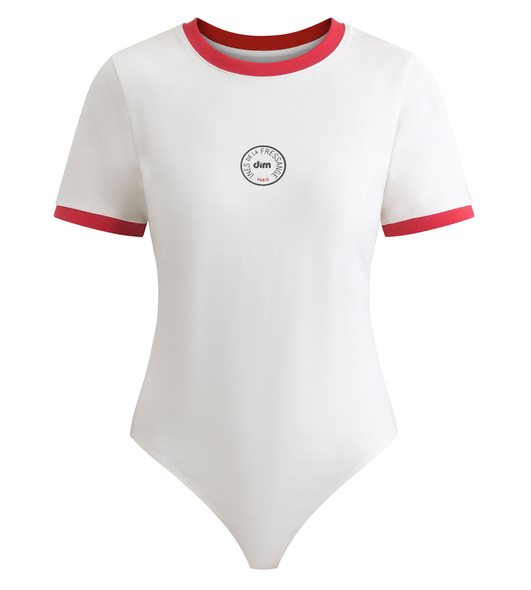 Adotta uno stile sporty chic con il body in madreperla Dim x Inès de La Fressange, caratterizzato da un colletto rosso a contrasto.