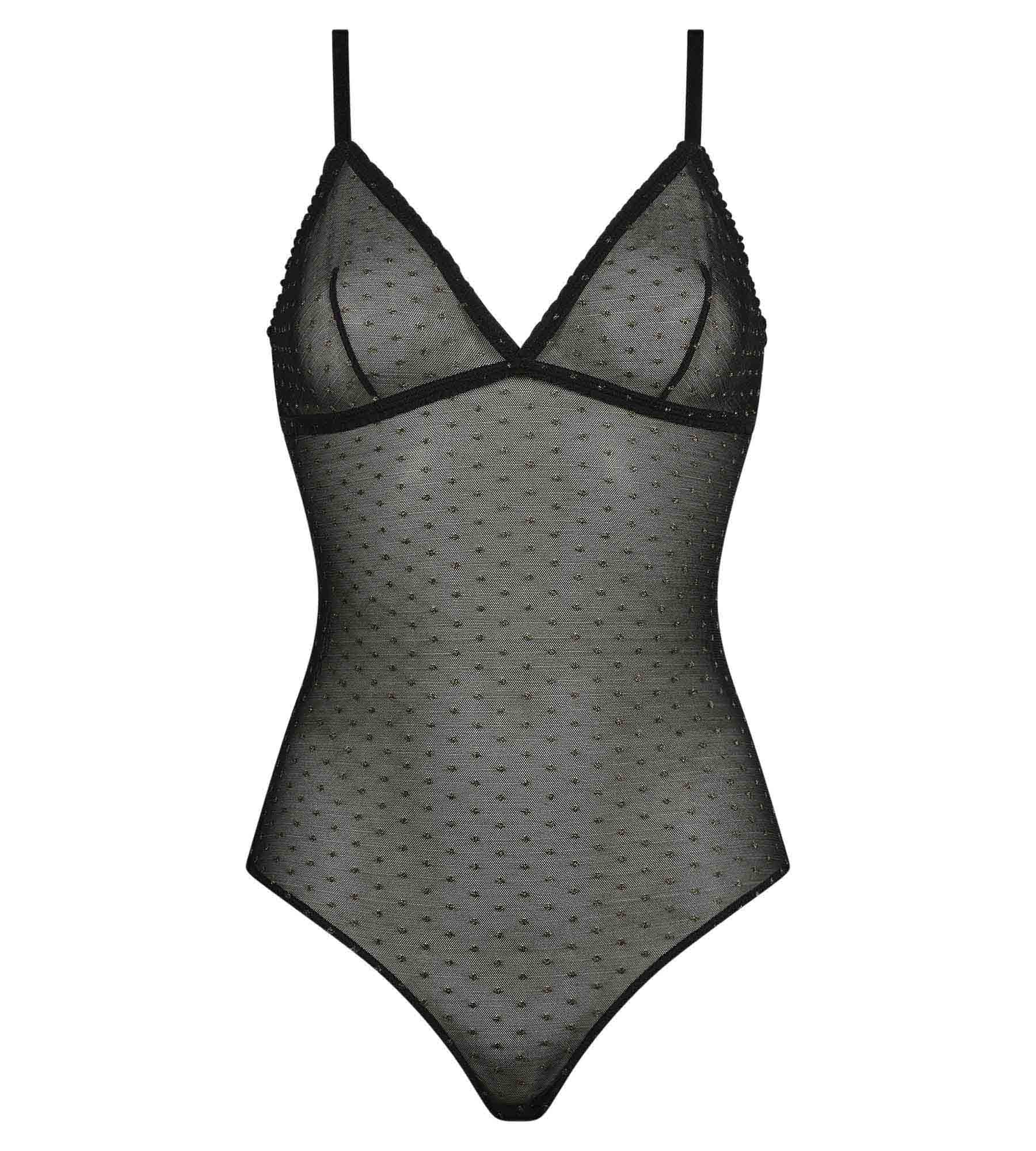 Indossa il body femminile Dim Shiny Mesh in voile traslucido dalla vestibilità slim! Grazie al reggiseno a triangolo integrato, con coppe foderate ed elastico sotto il seno, il body Dim® mette in risalto il tuo seno con morbidezza e femminilità. I pois in lurex, l'orlo arricciato e le spalline in raso ci fanno impazzire: sono ultra glamour! Indossato di giorno sotto un blazer da ufficio o di sera come top di tendenza, il body intimo Noir Shiny Mesh è il tuo nuovo accessorio di moda preferito!