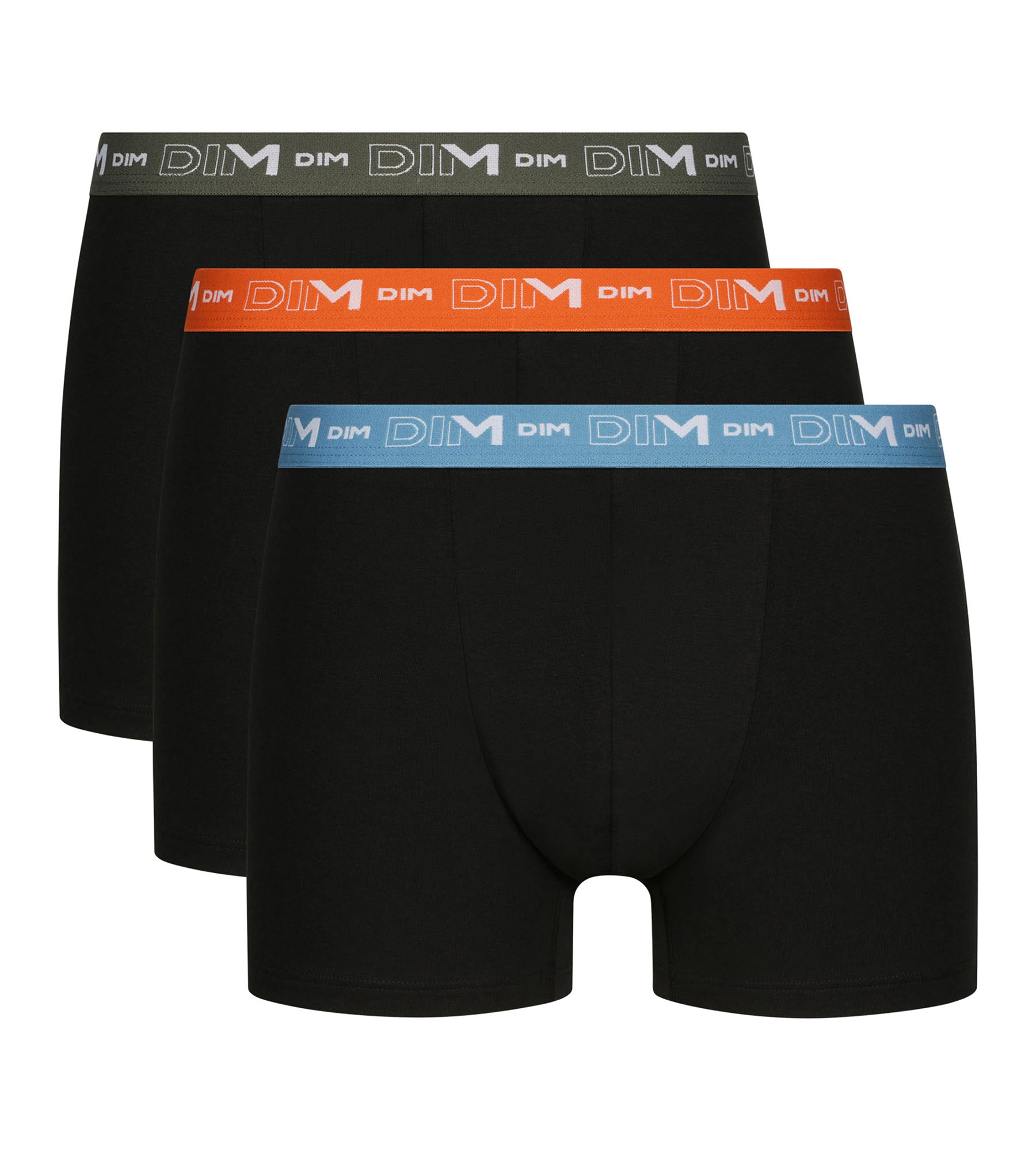 Scegli il comfort e il colore con il set di 3 boxer da uomo Dim Coton Stretch neri con cintura blu, arancione e verde!