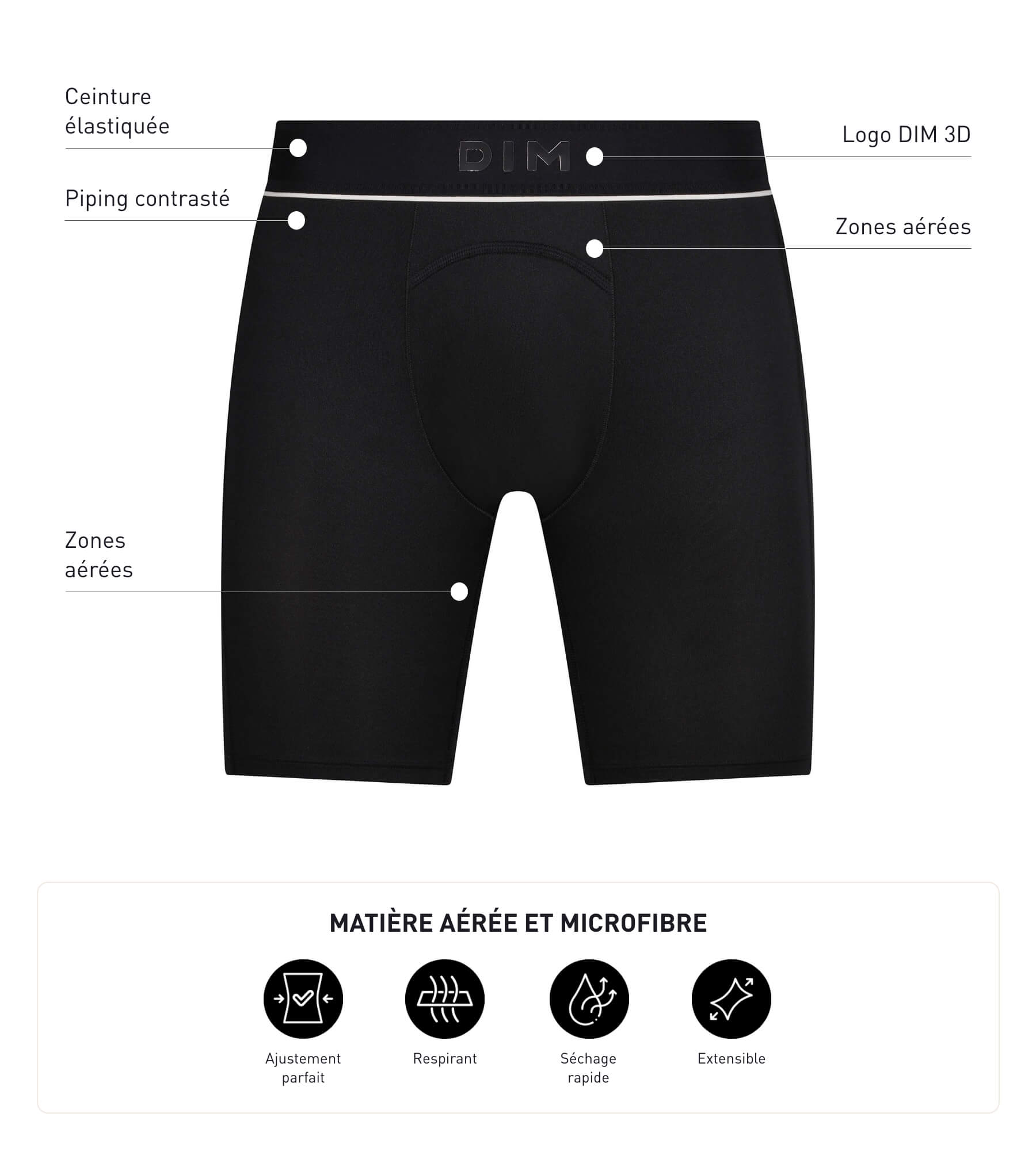 Adotta il design versatile e tecnico del boxer lungo da uomo DIM Move Black, che può essere indossato da solo o sotto il tuo abbigliamento sportivo! Realizzato in microfibra elasticizzata con fodera frontale, il boxer sportivo da uomo modella e sostiene il tuo corpo alla perfezione, come una seconda pelle. Grazie alle zone di ventilazione sul cavallo e sulla schiena, questo boxer sportivo DIM Move garantisce una sensazione di freschezza durante tutto l'allenamento.