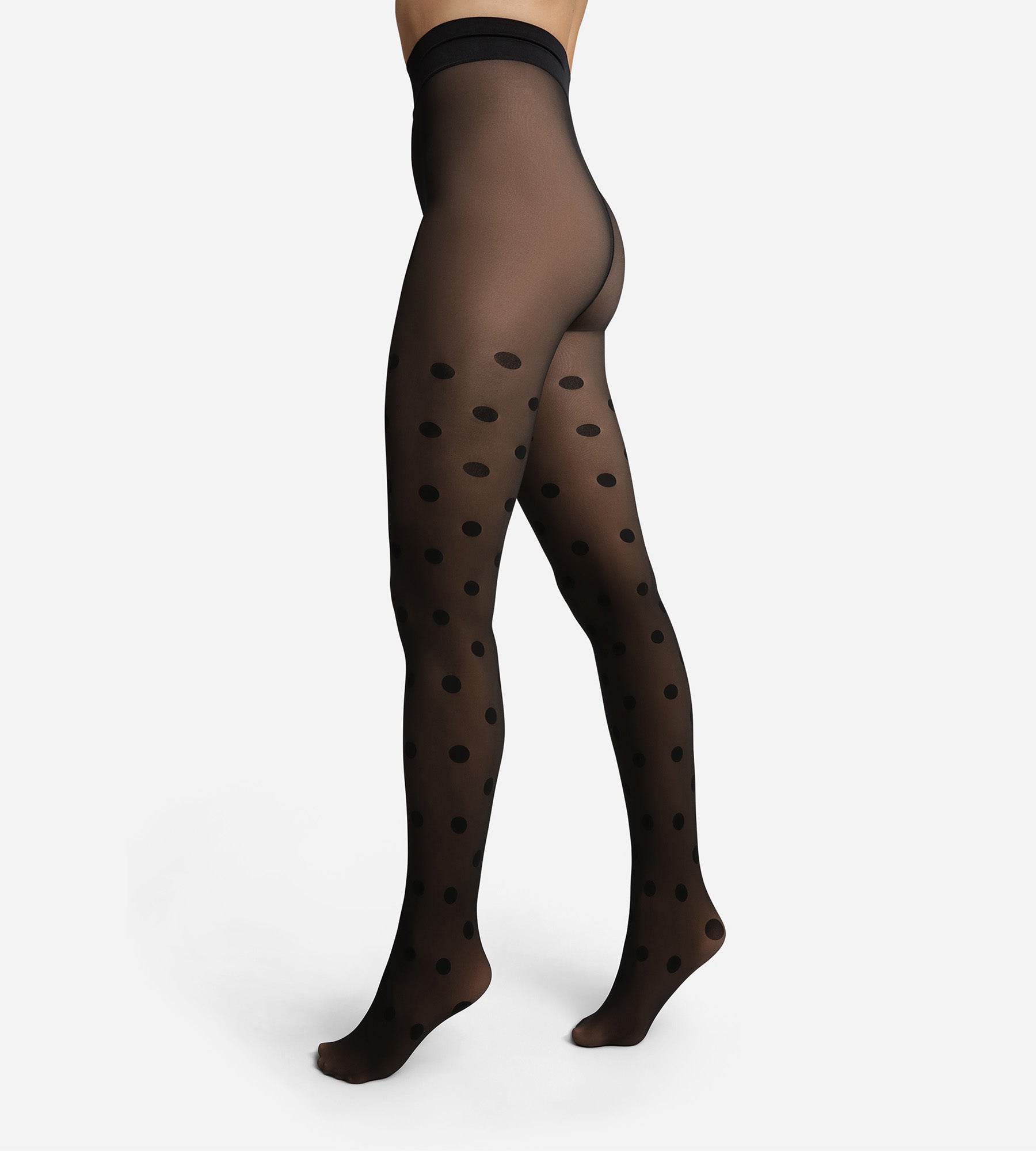 Combina calore e fantasia con i collant DIM Thermo neri, con il loro effetto trasparente a pois di tendenza.