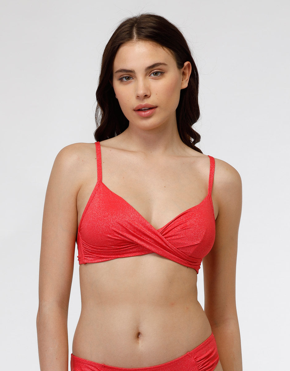 Costume da bagno nei toni del corallo con fili di lurex argentati lavorati nella struttura del tessuto in microfibra, che rendono il reggiseno non solo esteticamente piacevole ma anche comodo e morbido. Senza ferretto e con una profonda scollatura orizzontale. È presente una leggera imbottitura rimovibile. Il reggiseno si chiude sulla schiena con un comodo gancio. Le spalline possono essere regolate in base alle tue esigenze.