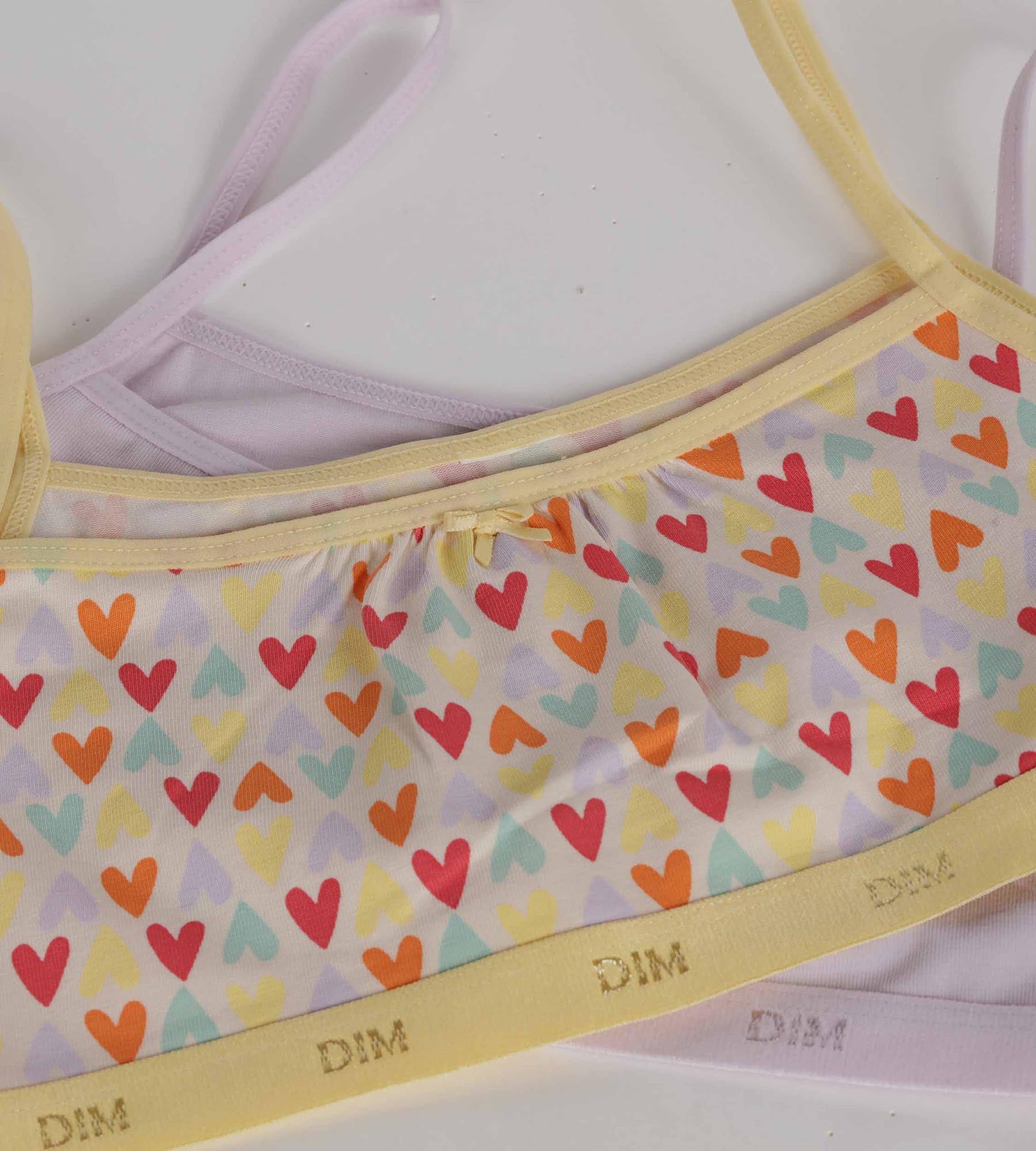 Per una giornata all'insegna del comfort e dell'eleganza, scopri il set di 2 reggiseni per bambine Les Pockets in cotone elasticizzato giallo e lilla con motivo a cuore!