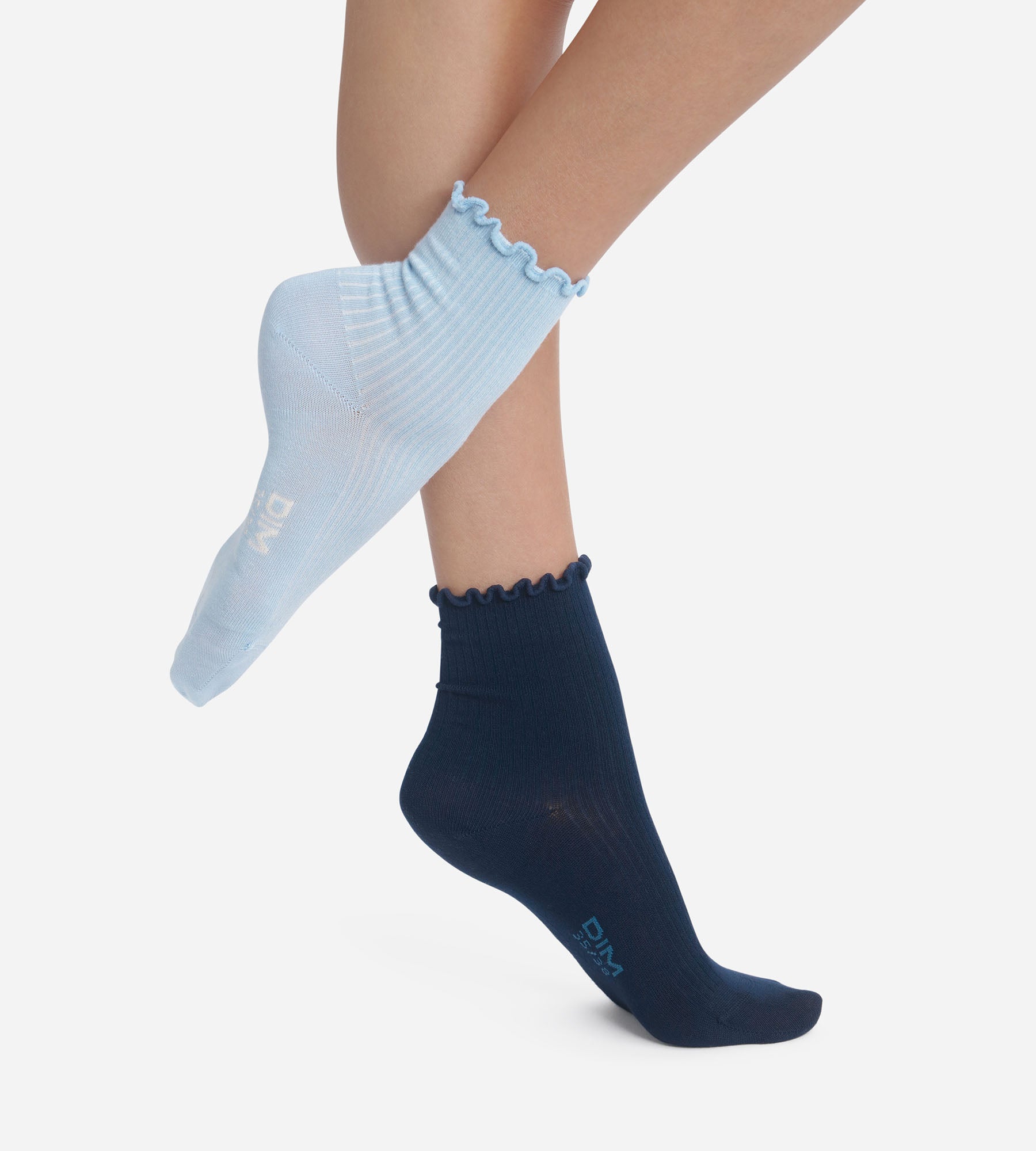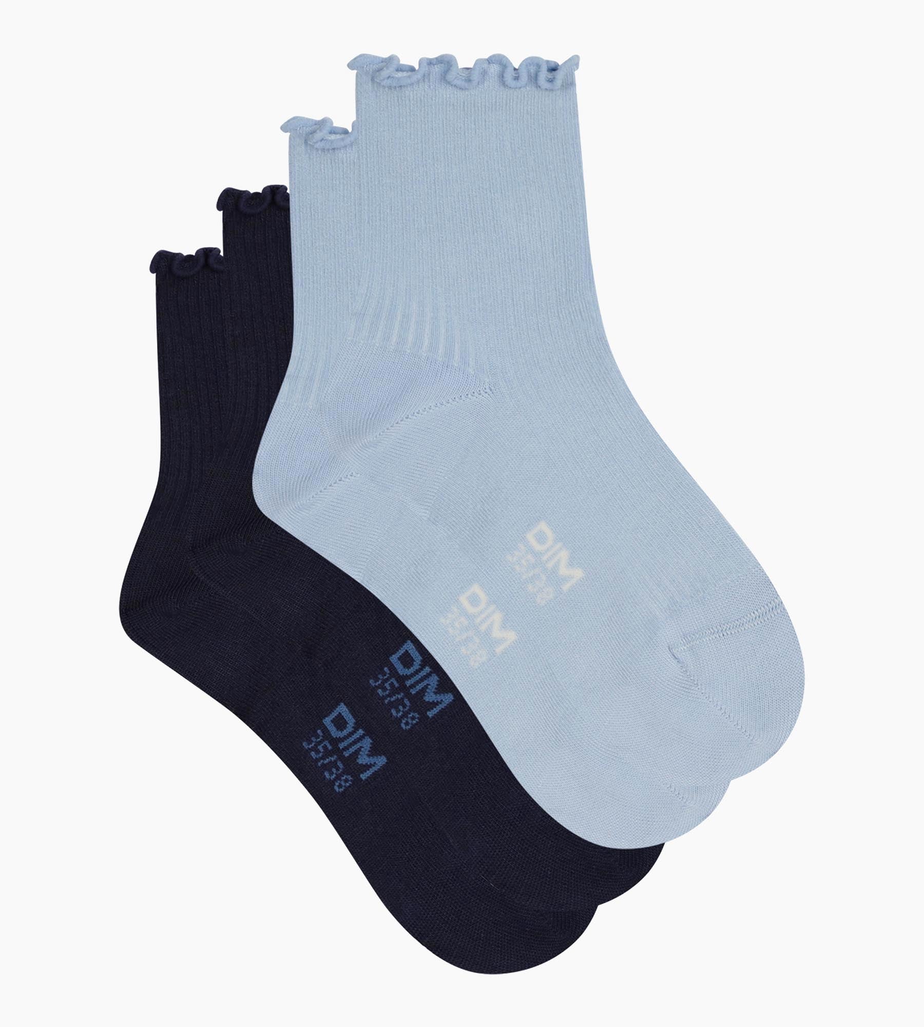 Look delicato e dettagli femminili: il pacco da 2 paia di calzini da donna in cotone blu navy/azzurro cielo Dim Modal rivisita un classico con un bordo ondulato molto femminile.