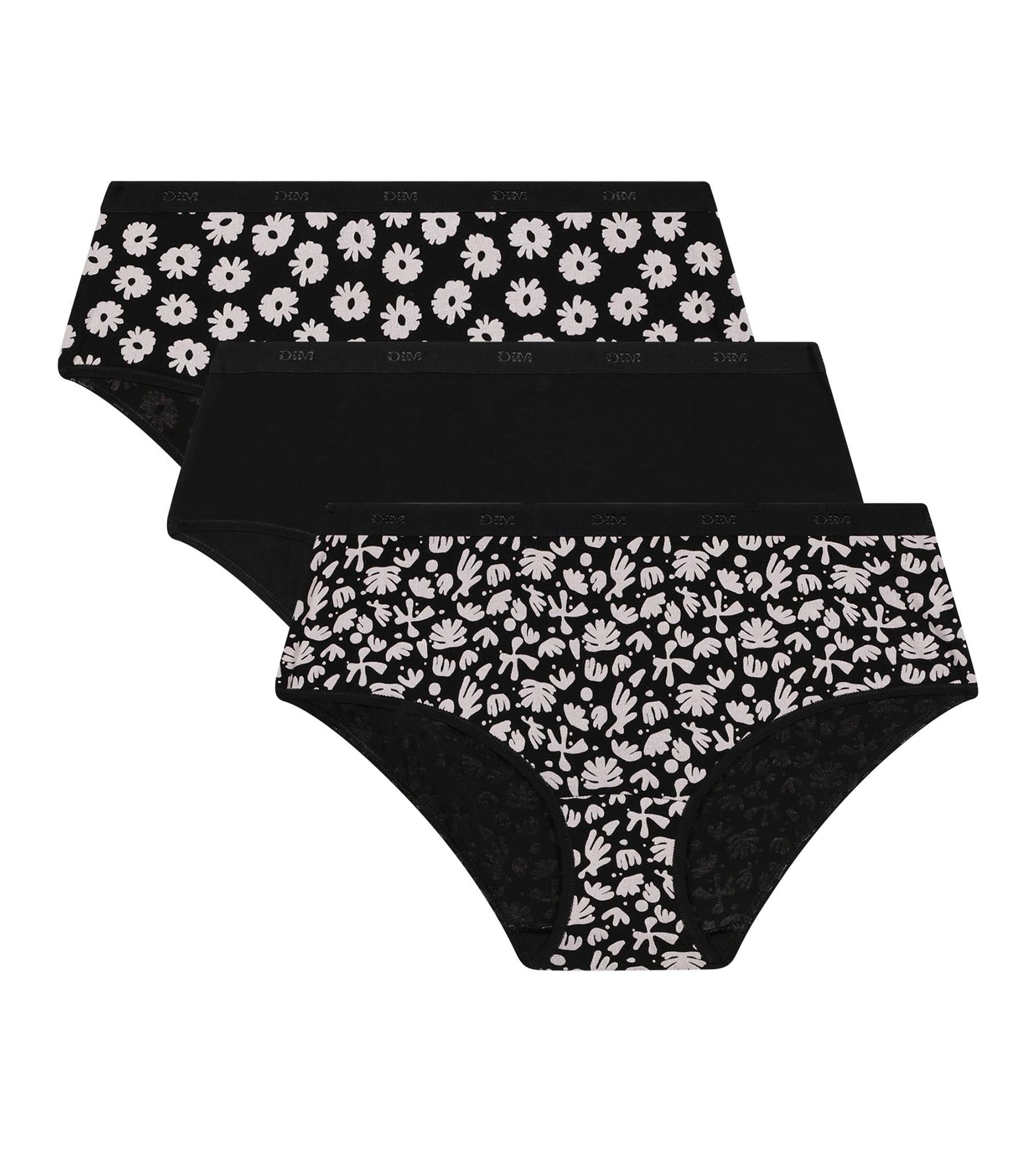 Comodo e sobriamente femminile, scegli il set di 3 shorty da donna Les Pockets di Dim in cotone elasticizzato nero e crema con motivo floreale!