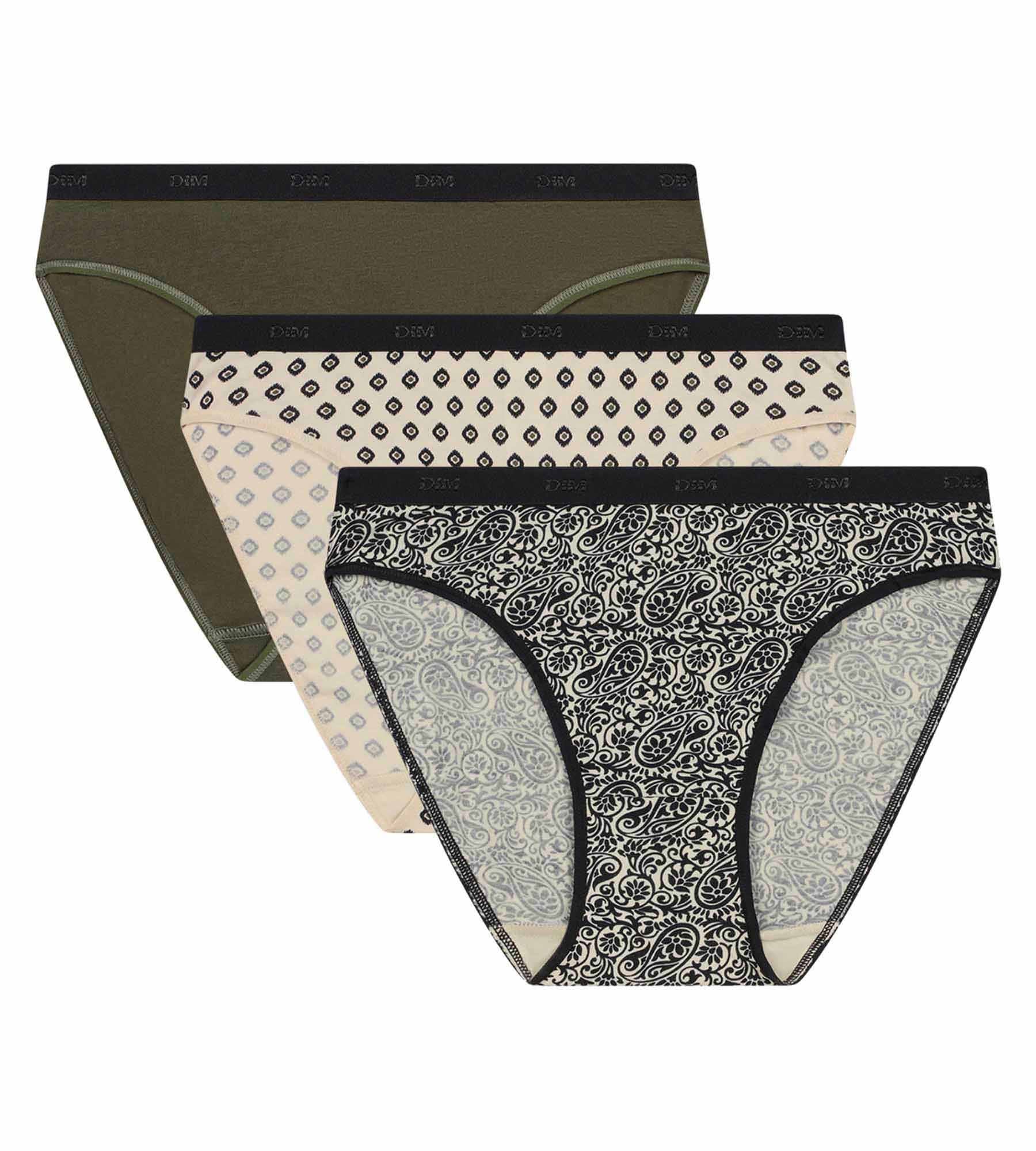Aggiungi un tocco orientale al tuo intimo con questo set di 3 slip da donna Dim Les Pockets con motivi etnici neri, cachi ed ecrù.