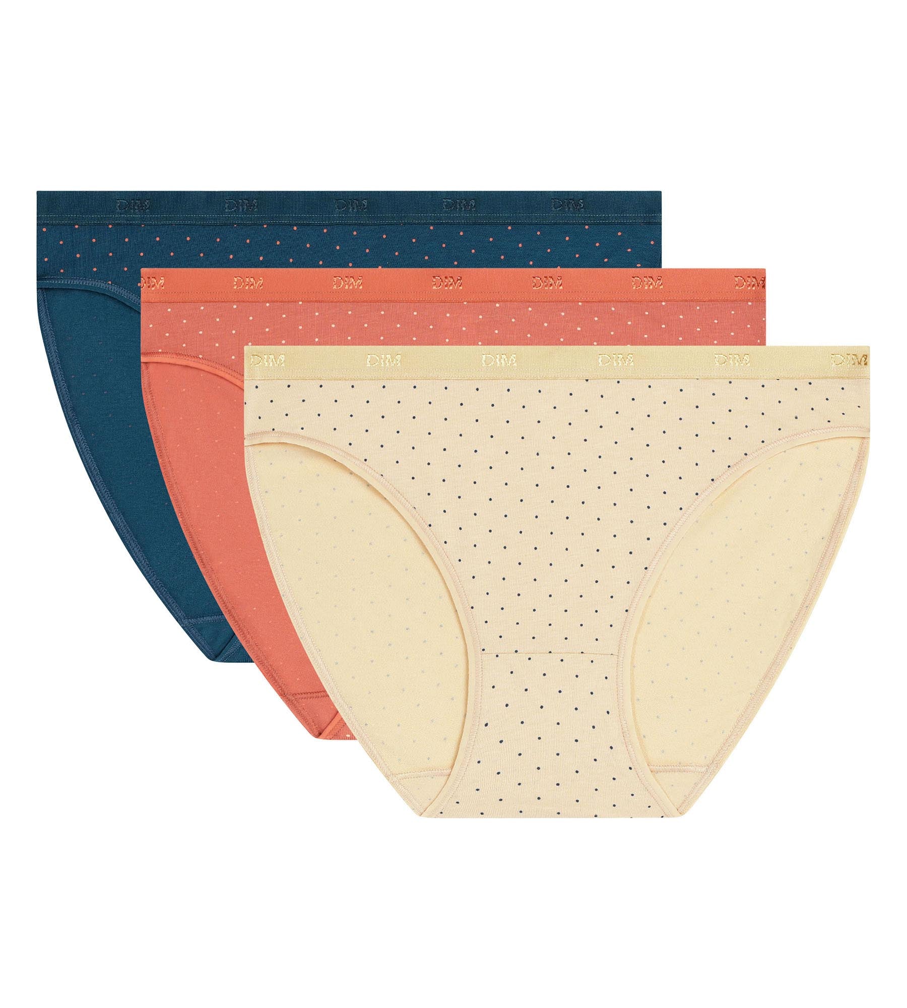 Celebra l’intramontabile motivo a pois con questo lotto di 3 slip da donna Dim Les Pockets in cotone elasticizzato, dallo stile vintage rivisitato.
