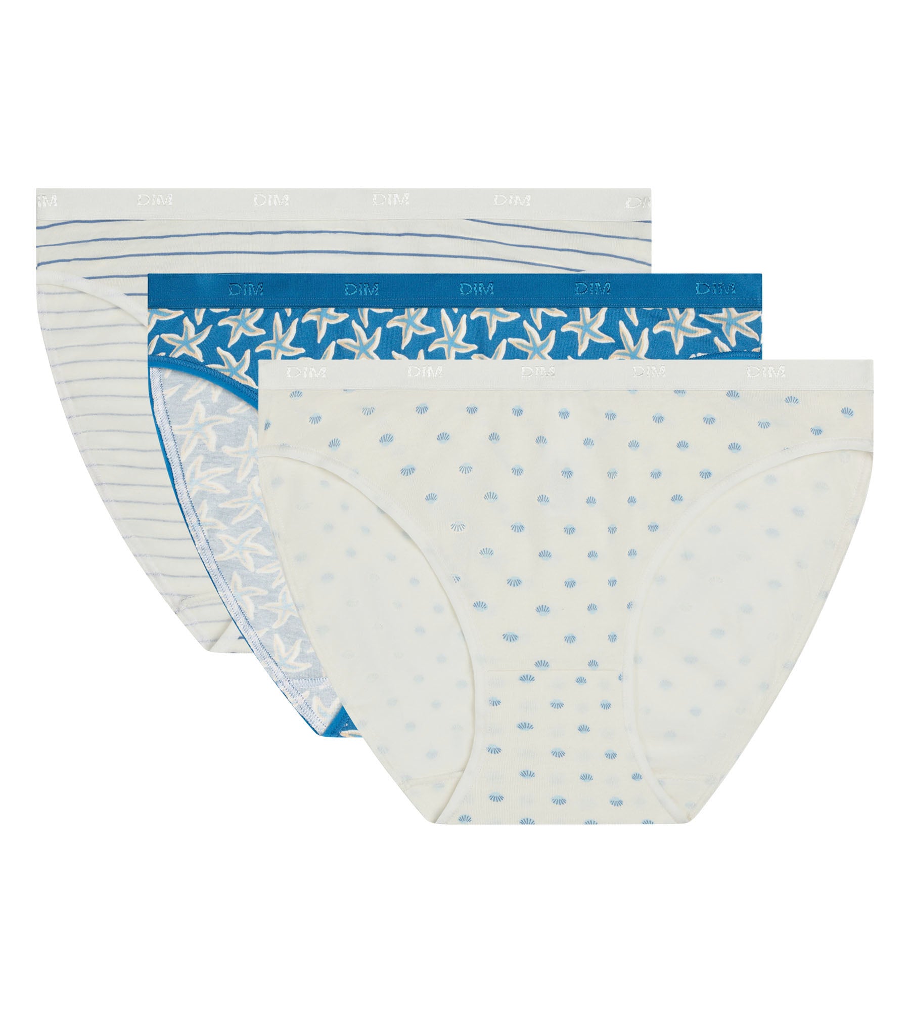 Mostra il tuo look da spiaggia con il lotto di 3 slip da donna Les Pockets di Dim in cotone elasticizzato, con colori e motivi ispirati all’oceano.