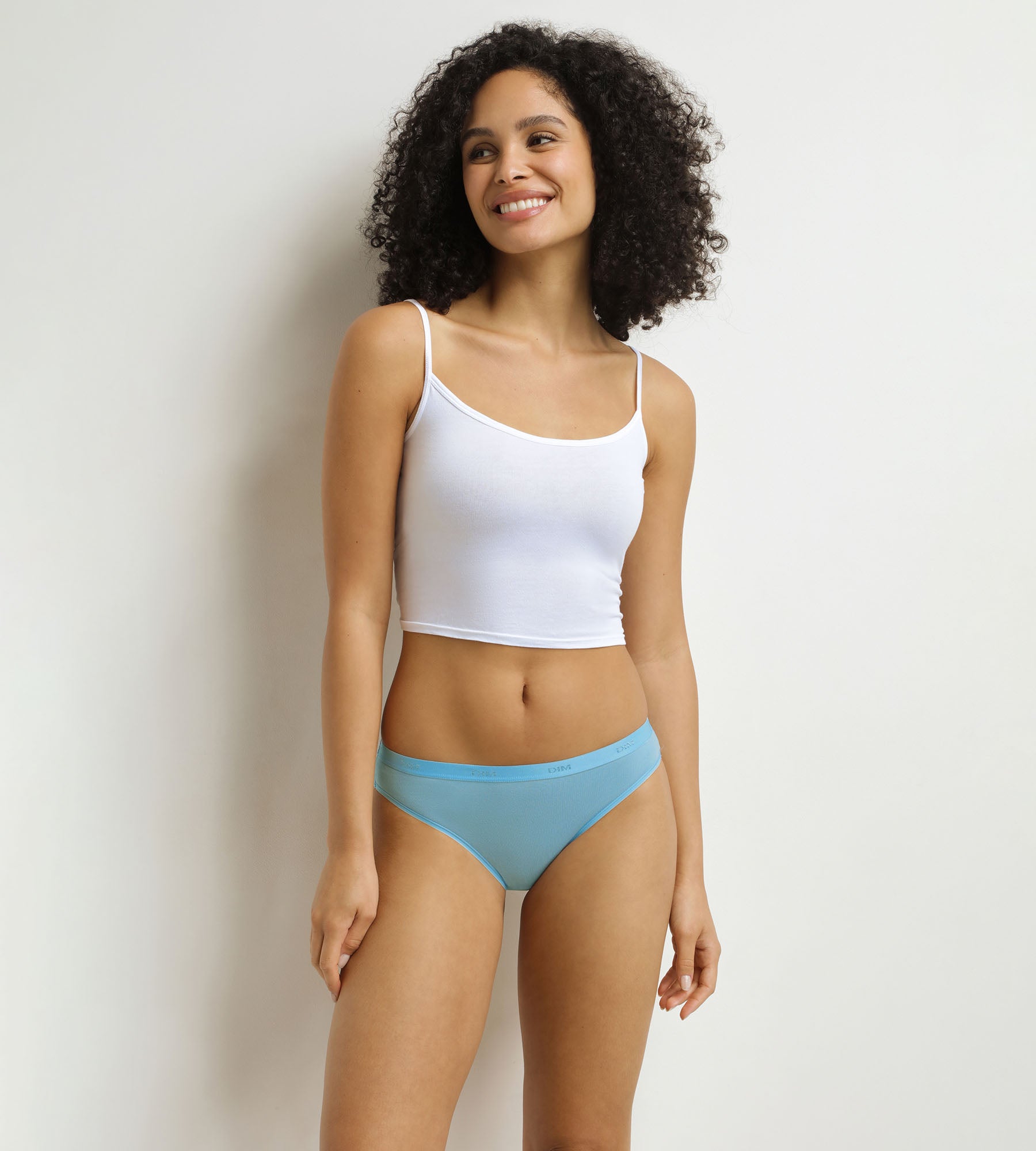 - La fascia in vita in raso tono su tono con logo DIM, per un tocco pulito