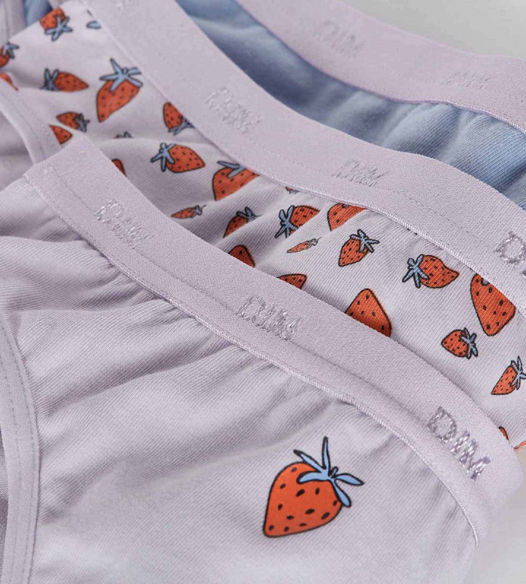 Il set di 3 slip da bambina in cotone elasticizzato Lila con stampa a fragola di Dim è l'aggiunta perfetta al tuo intimo da teenager!