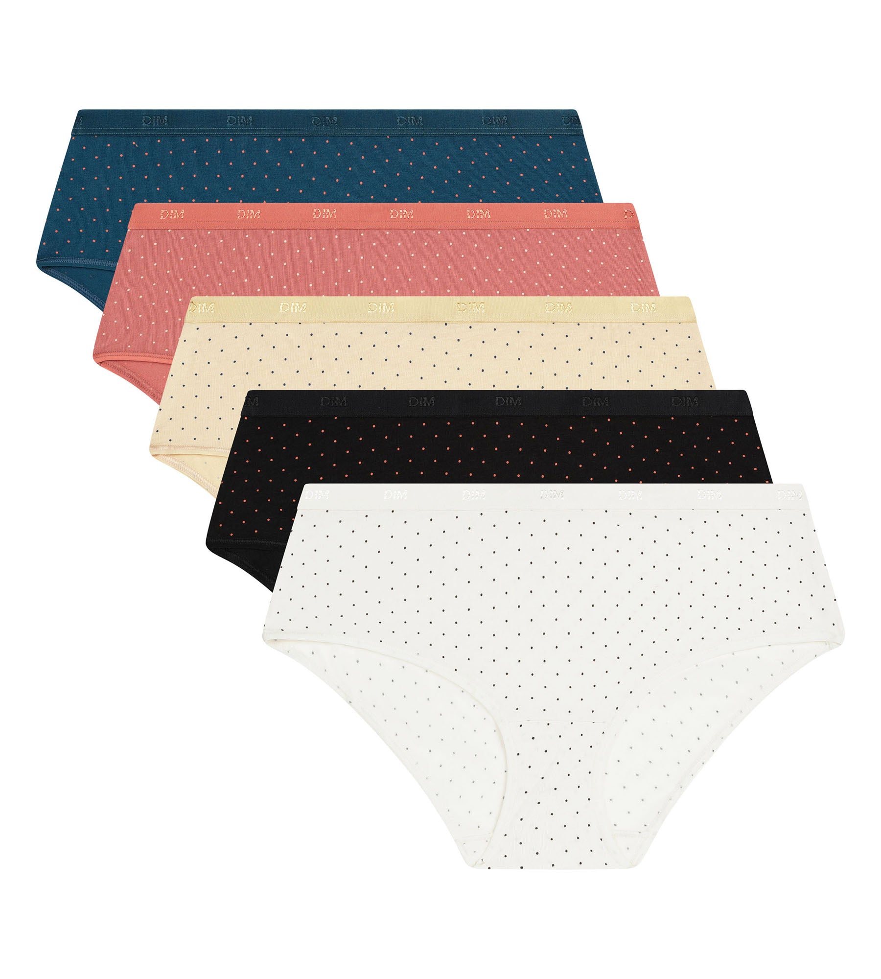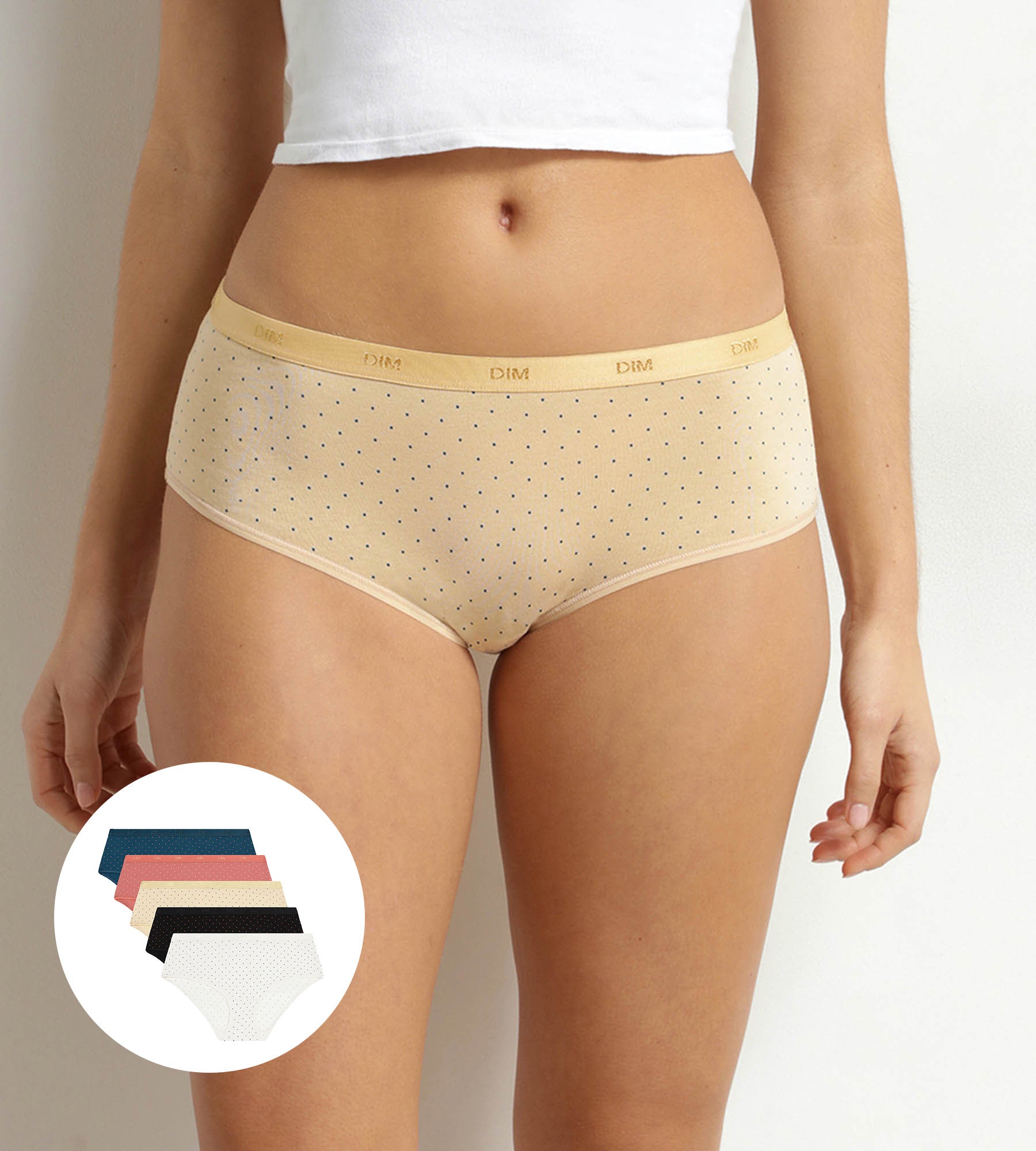 Rispolvera il intramontabile motivo a pois con questo lotto di 5 boxer da donna Dim Les Pockets in cotone elasticizzato, dai toni caldi e attuali.