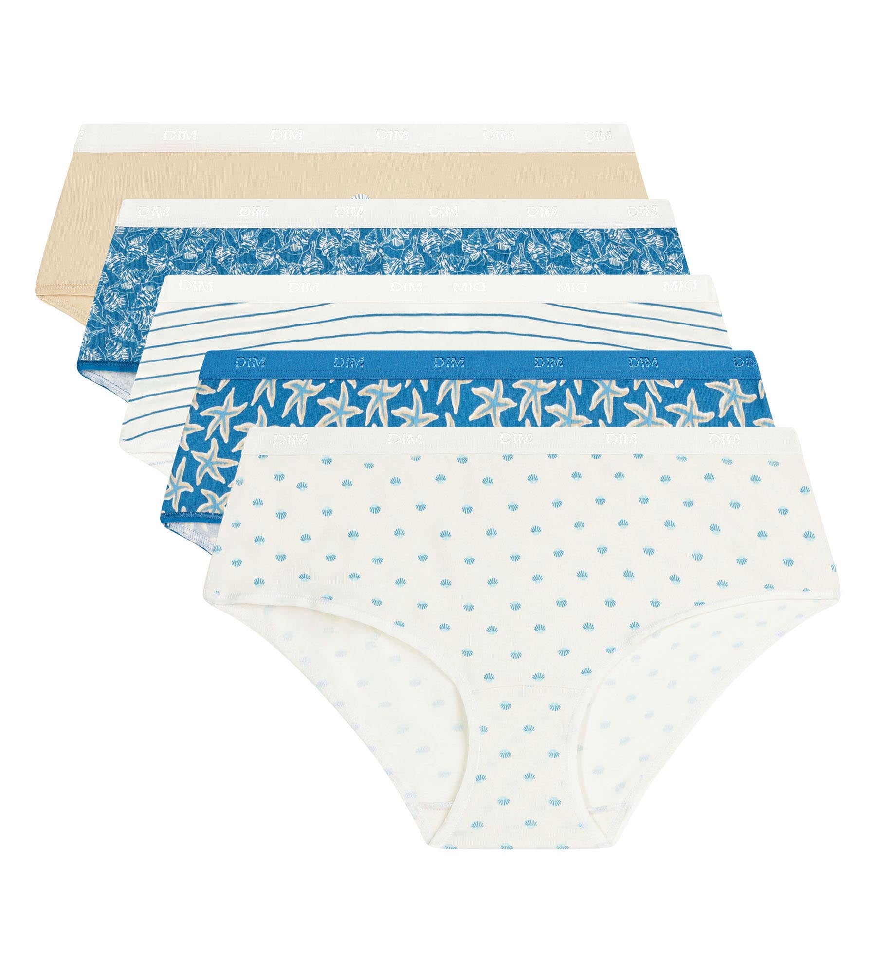 Cambia aria con il lotto di 5 boxer da donna Beige, Bleu Les Pockets di Dim, con motivi in stile crociera.