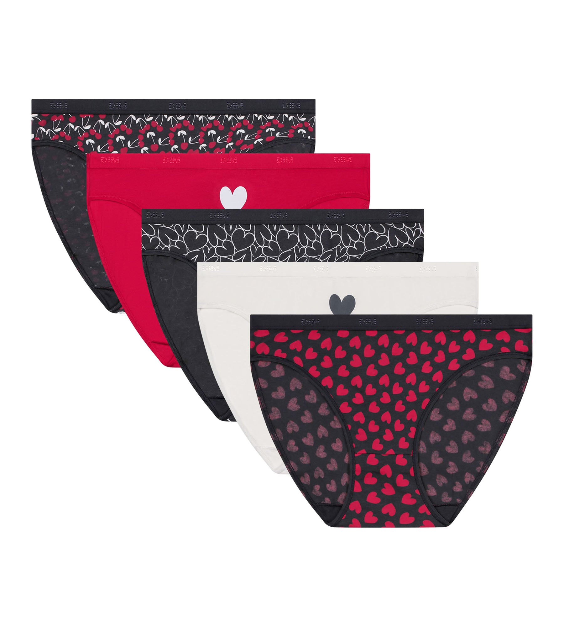 Con la sua tavolozza di colori rosso, nero e bianco e le variazioni di stampe a forma di cuore, il set di 5 slip-donna-1 di Les Pockets è un'audace interpretazione dei codici dell'amore! Progettate per essere comode da indossare ogni giorno, le dim-pockets da donna in cotone elasticizzato sono morbide, soffici e non comprimono la pelle.