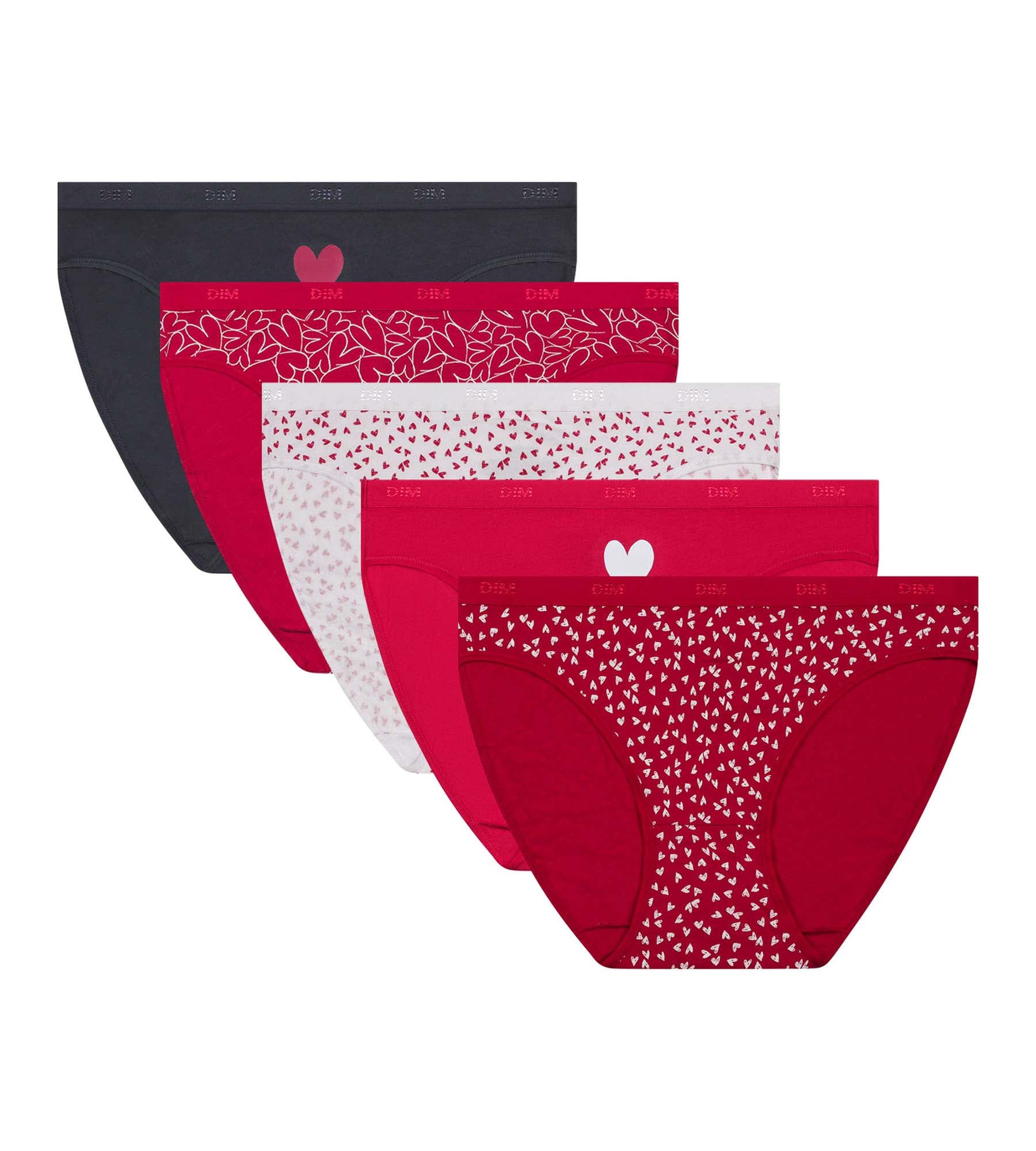 Sfoggia un affascinante look regressivo con questo set di 5 slip da donna in cotone elasticizzato rosso, bianco e nero di Dim, con motivi a cuore!