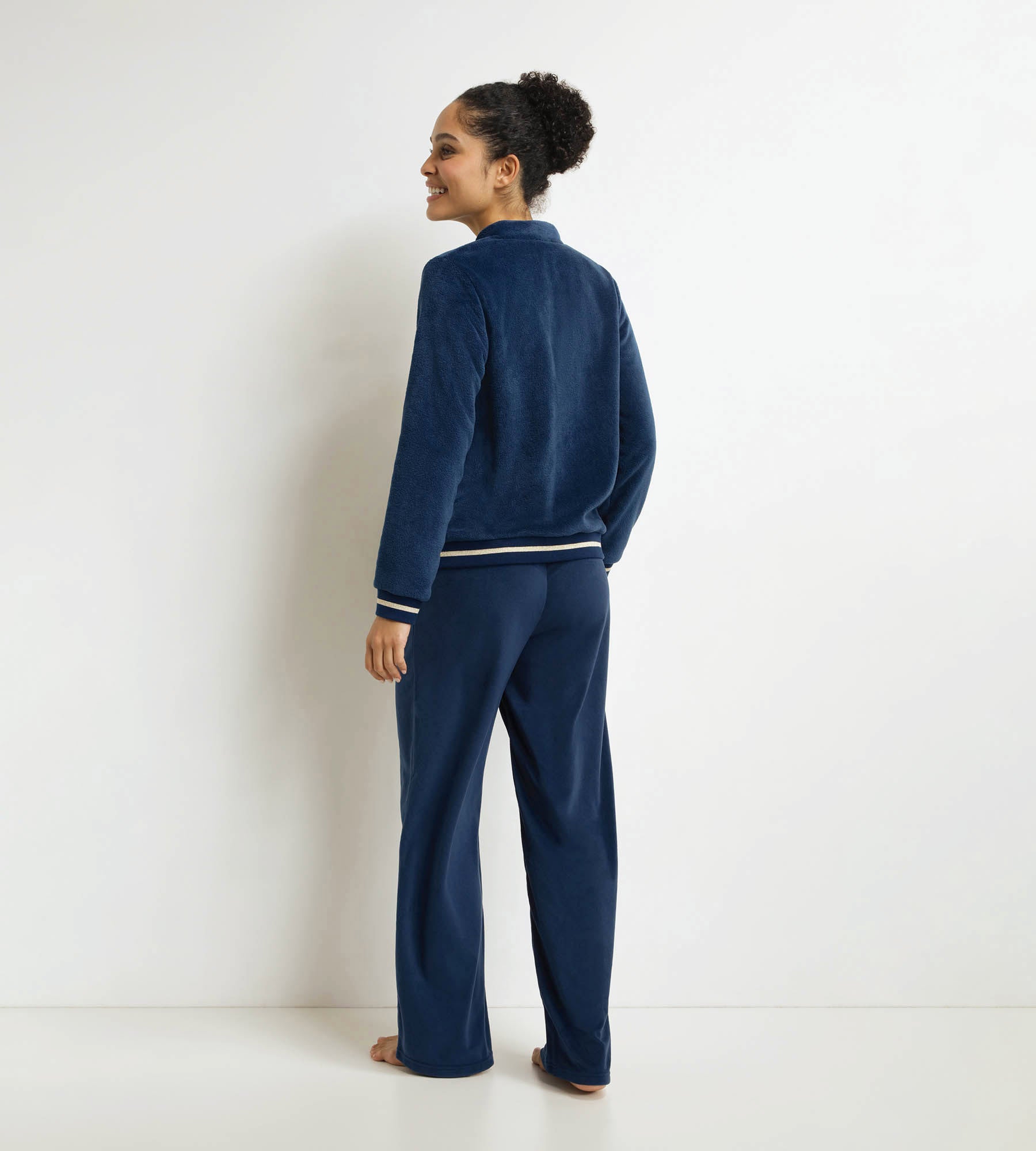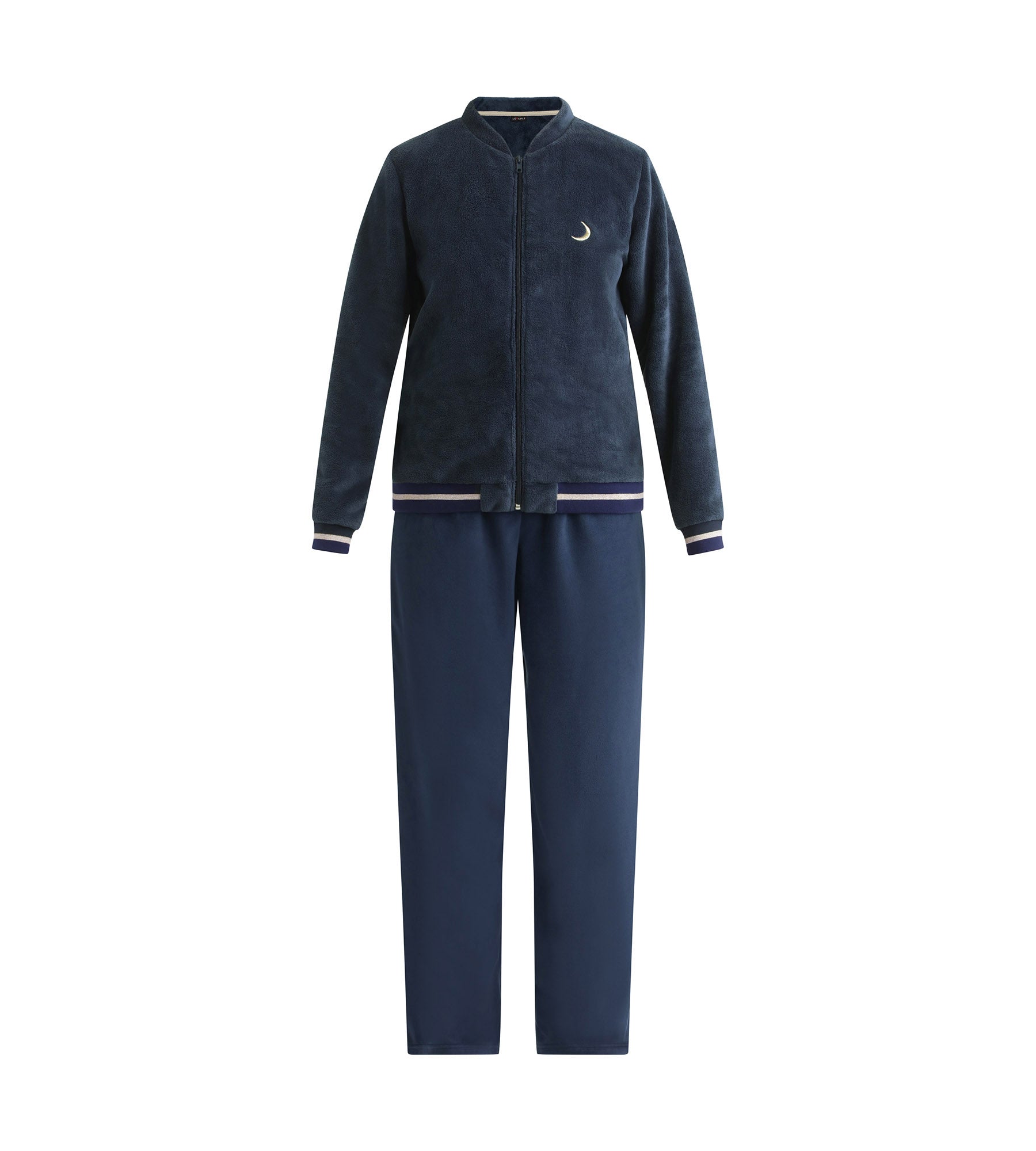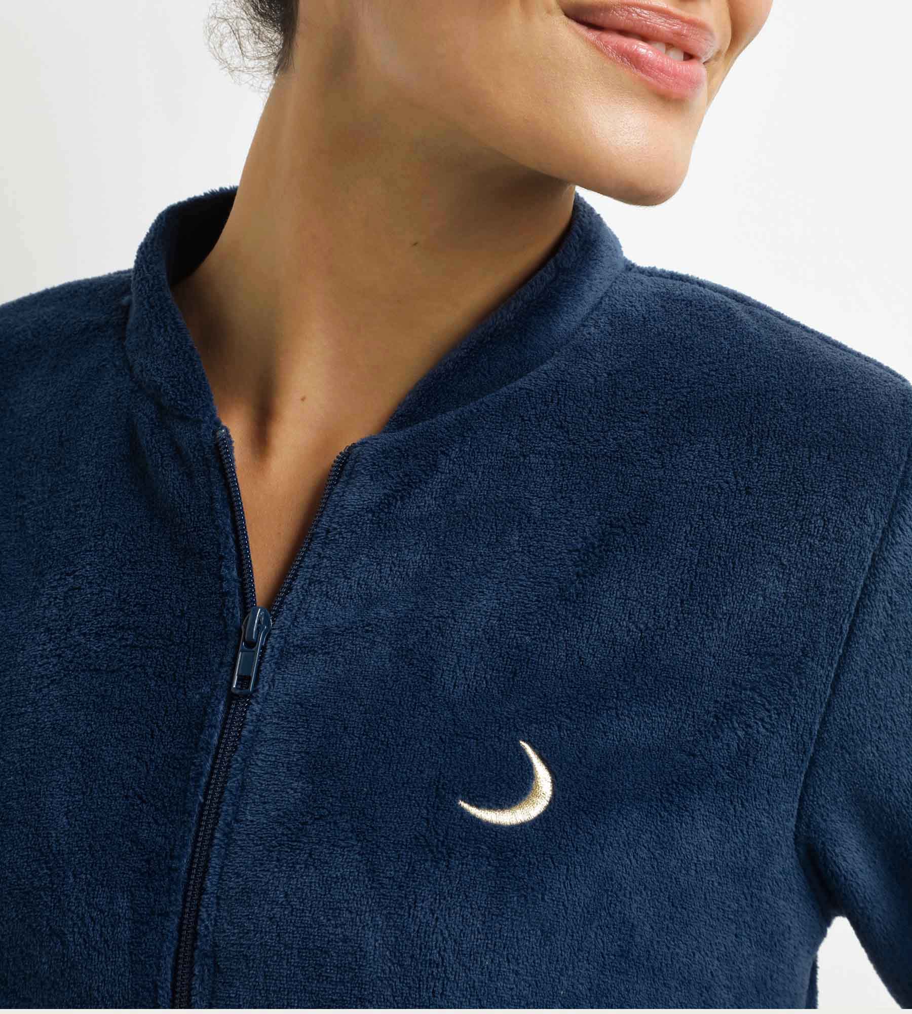 Accogliente e pratico, questo pigiama in velluto Dim ti terrà al caldo. Il top con zip ha un colletto rotondo, una vestibilità comoda e un piccolo motivo a luna ricamato sul lato del cuore. I pantaloni fluidi sono facili da regolare grazie alla coulisse in vita. Gli accenti dorati sul colletto, sui polsini e sulla vita aggiungono un tocco chic a questo set blu notte. Un pigiama da donna ideale per rilassarsi con stile.