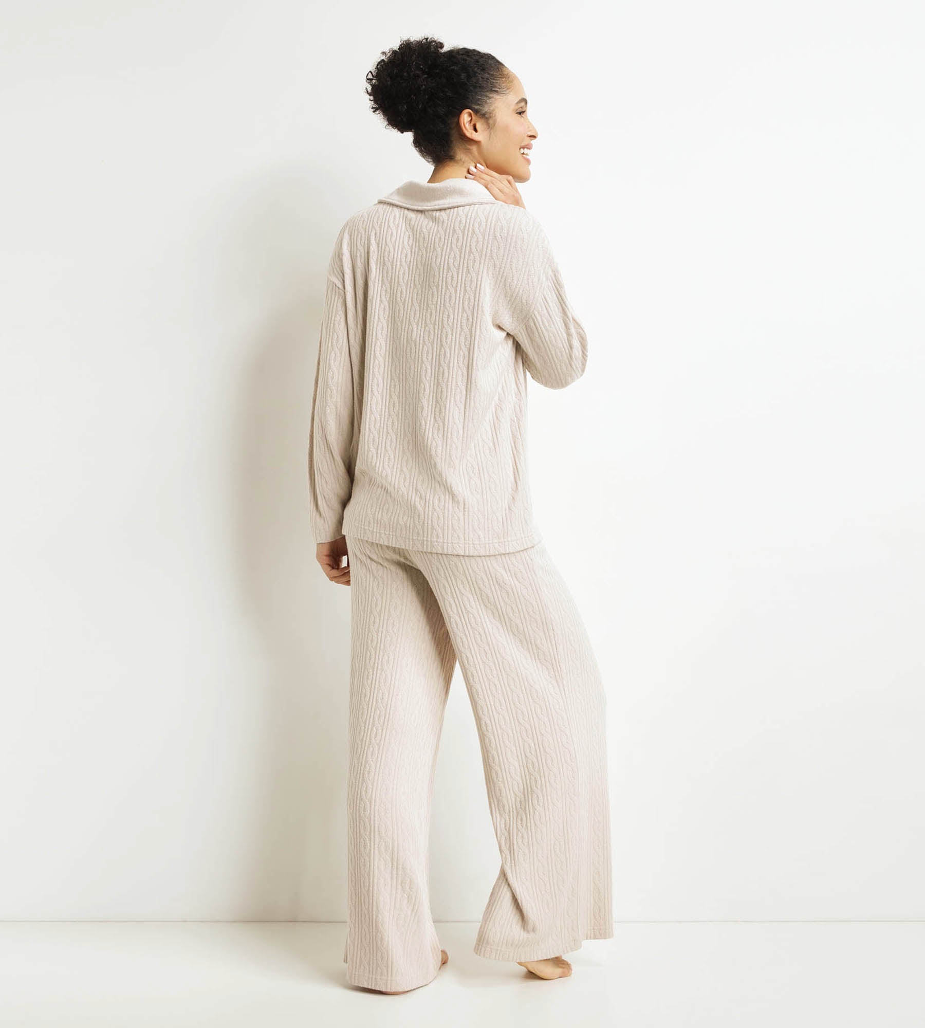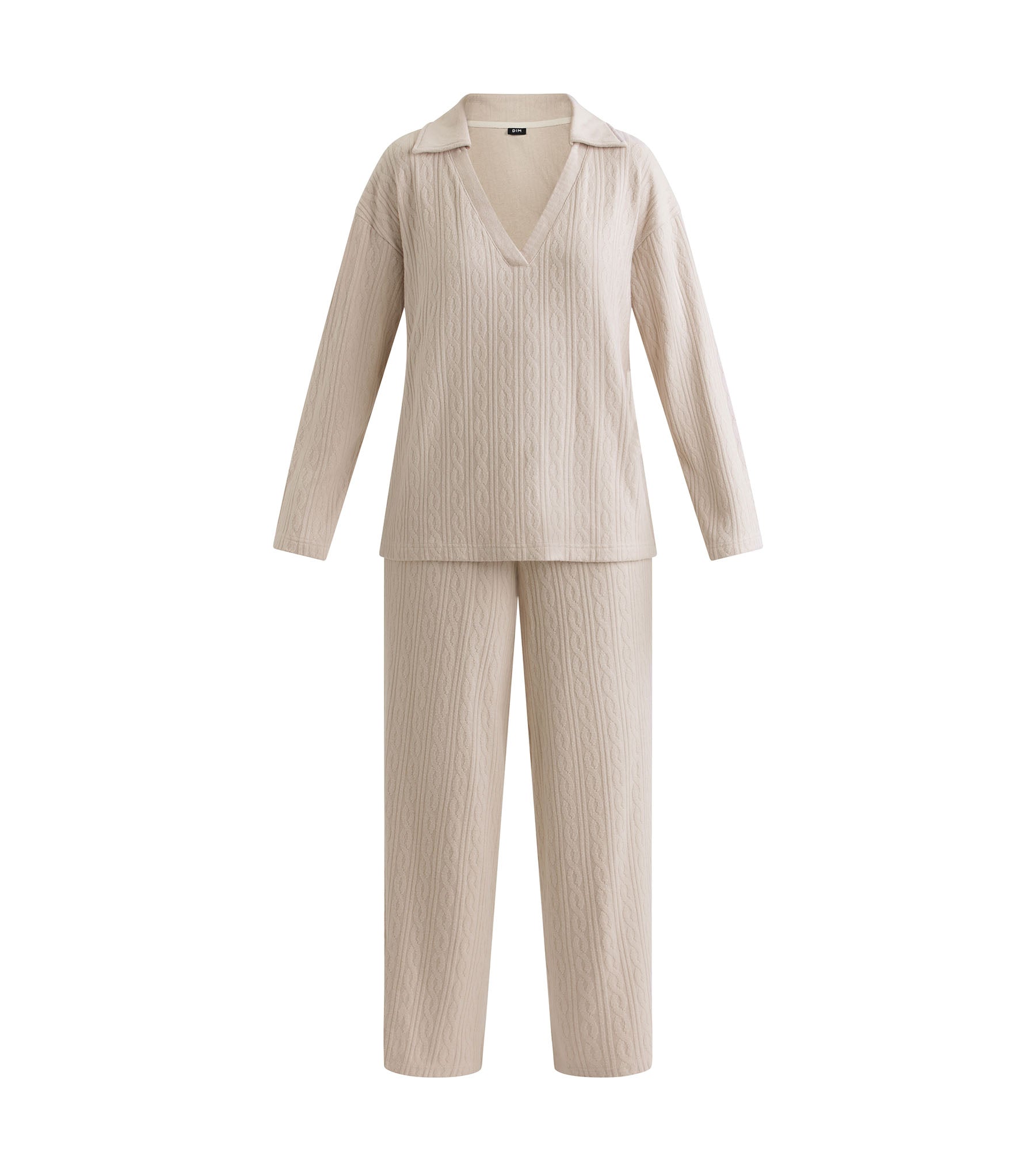 Indossa comodamente questo pigiama donna DIM Warm in maglia a trecce color avorio: un mix perfetto di eleganza casual.