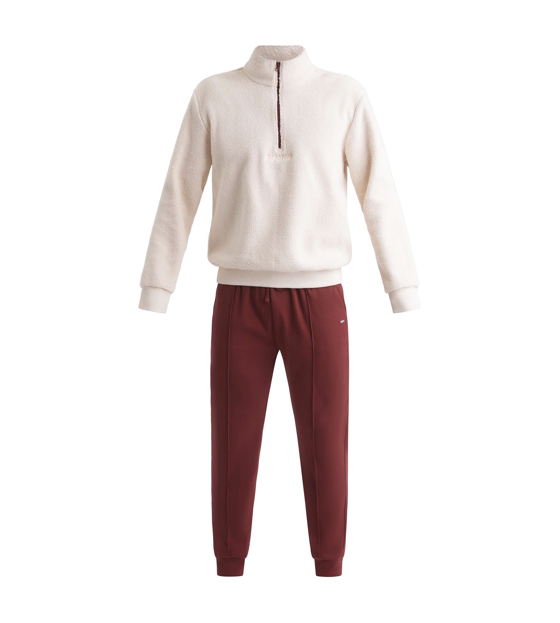 Questo pigiama da uomo Dim® combina una morbida e calda maglia effetto lana con una vestibilità moderna e rilassata. Il top, con il suo collo alto con zip e le costine spesse, tiene lontano il freddo e sottolinea il punto vita. I pantaloni classici da jogger hanno due pieghe sul davanti per aggiungere struttura. Grazie alla vita elasticizzata, questo pigiama si adatta e si muove perfettamente con te. Il discreto ricamo sul top aggiunge un tocco finale sobrio e urbano.