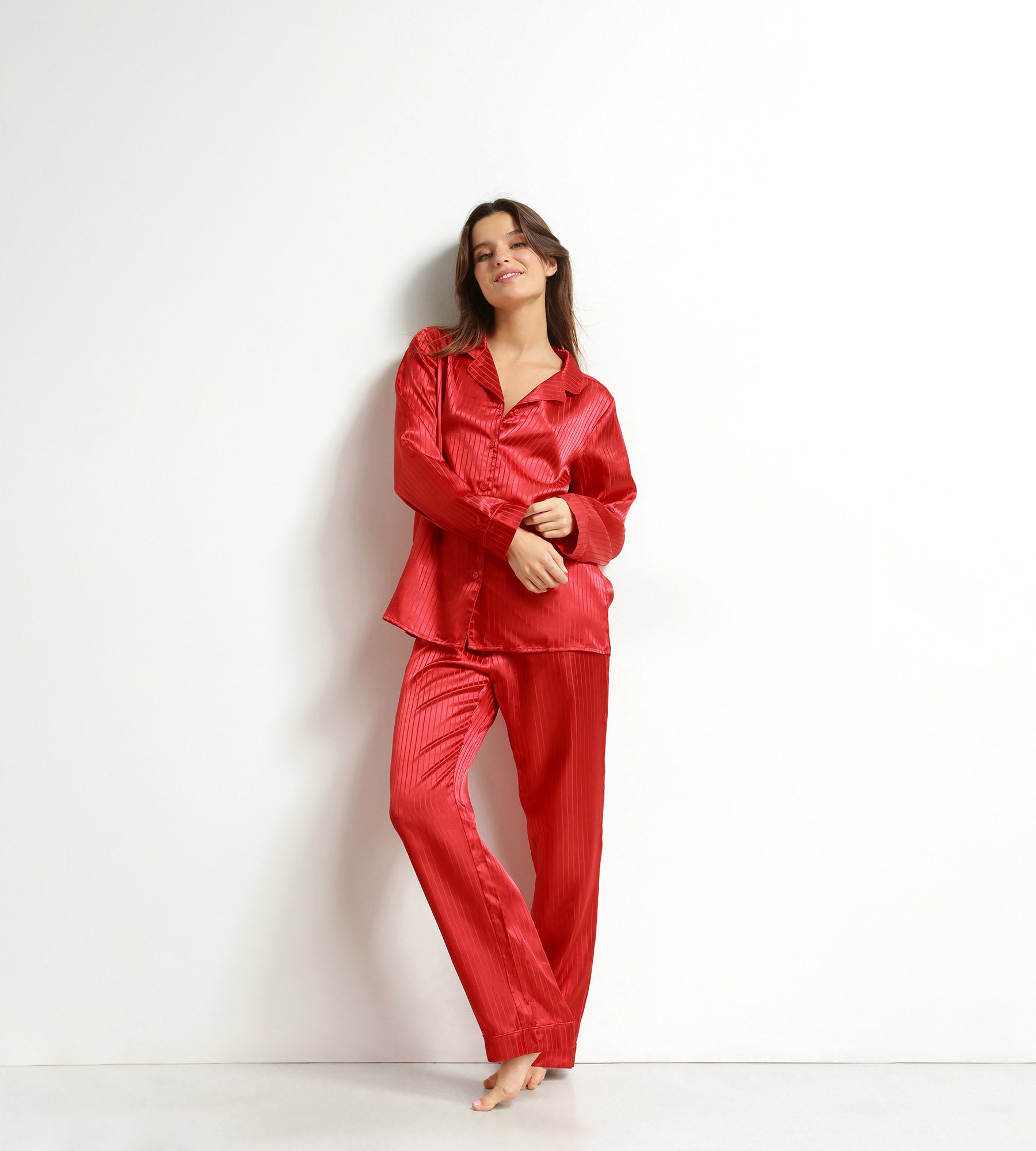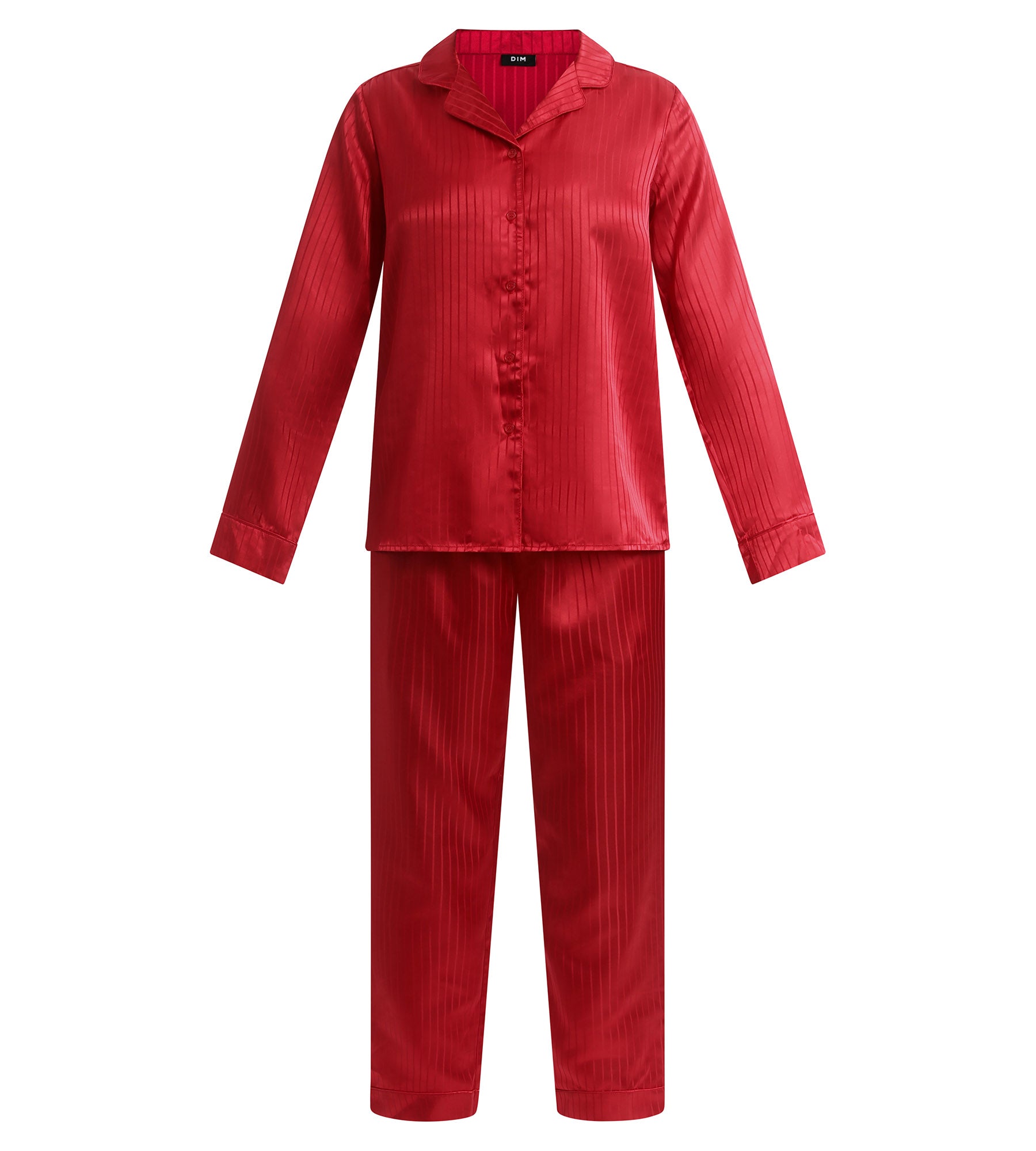 Pensato per chi non rinuncia mai allo stile, anche a casa, questo pigiama Dim da donna della linea Don’t Disturb punta sull’eleganza del raso. Il rosso Valentino luminoso dona carattere, l’effetto a righe lucide dà rilievo, il bordo a contrasto afferma uno spirito couture. La camicia a maniche lunghe e i pantaloni ampi offrono una totale libertà di movimento, scolpendo al contempo una silhouette femminile e rilassata. Un completo che trasforma le tue serate cocooning in momenti di moda!