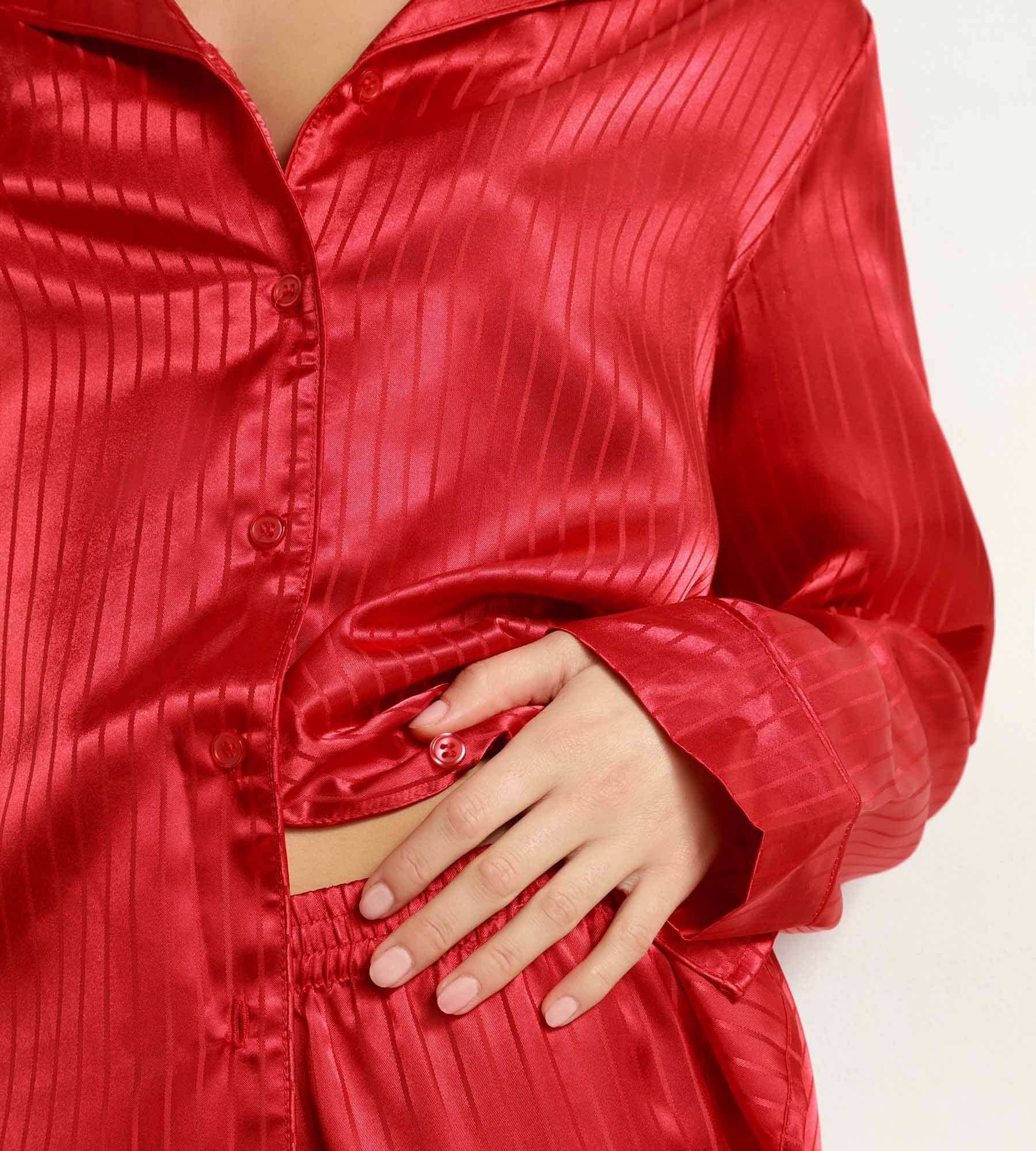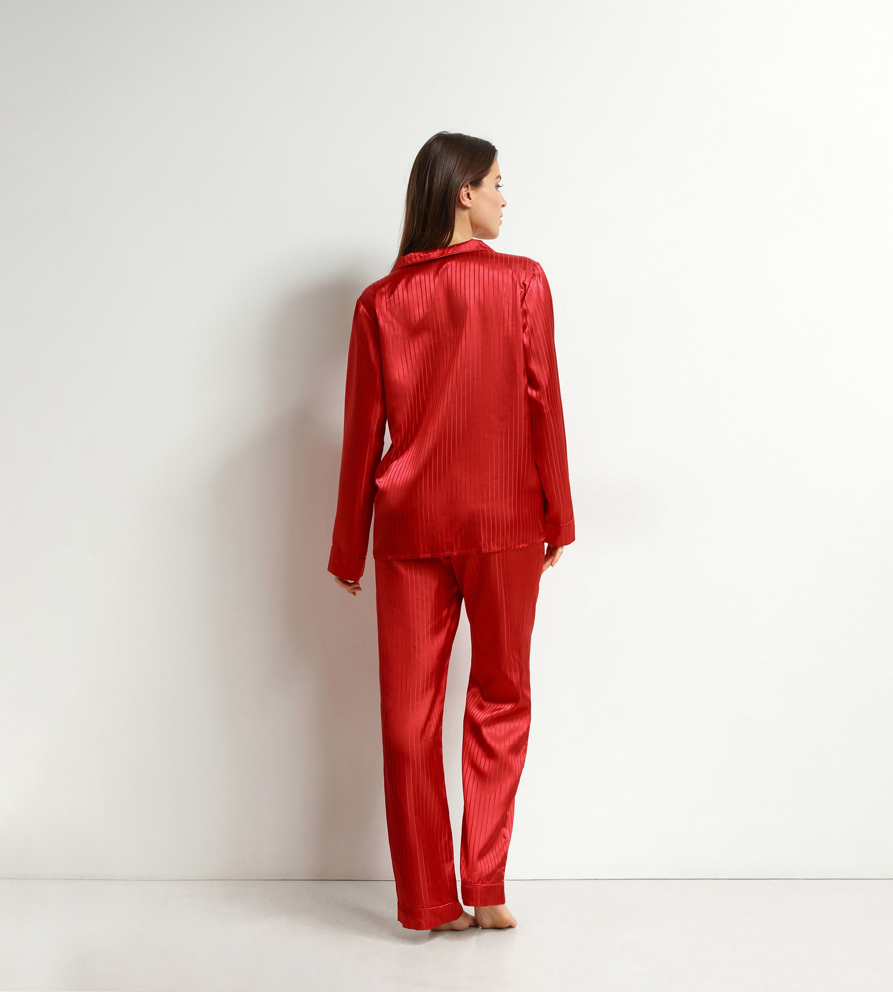 Glamour e comfort si uniscono nel completo pigiama da donna Dim Don’t Disturb in raso rosso Valentin con effetto a righe lucide, perfetto per notti alla moda!