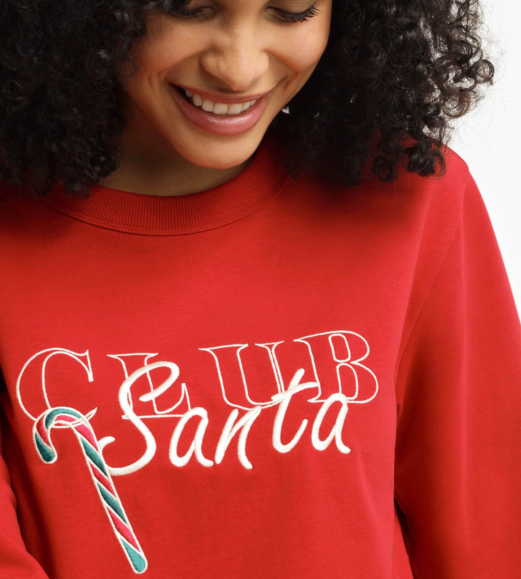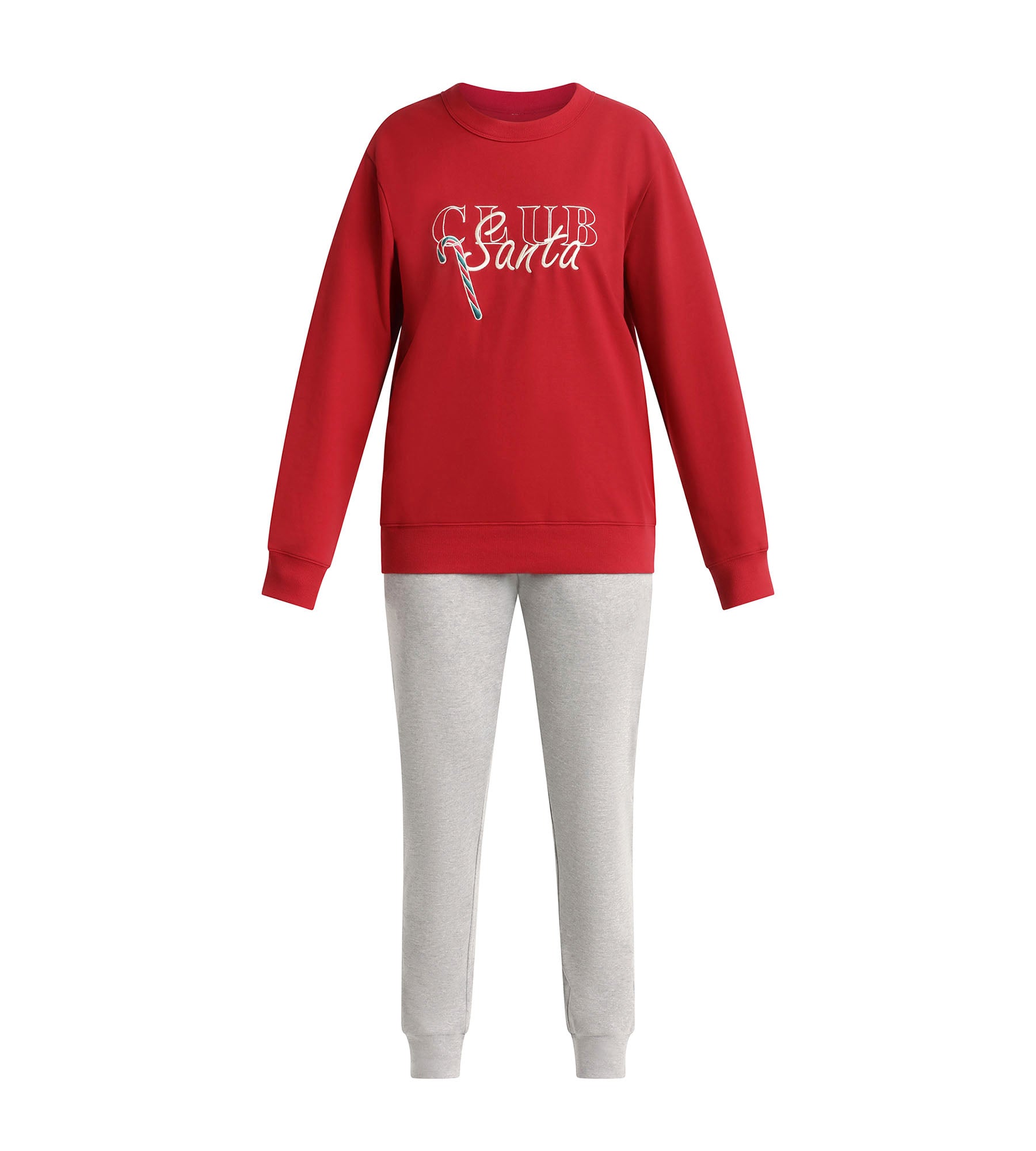 Questi pigiami da donna di Dim combinano comfort e allegria in un duo di tonalità morbide e vitaminiche. Il top a maniche lunghe in rosso brillante presenta un messaggio "Club Santa" ricamato che dà il tono alle serate di relax. I pantaloni jogger in grigio mélange completano il mio coordinato con semplicità. Grazie al tessuto morbido e alle finiture pratiche, questo modello DIM Family è un must-have per outfit da interno accoglienti e divertenti.