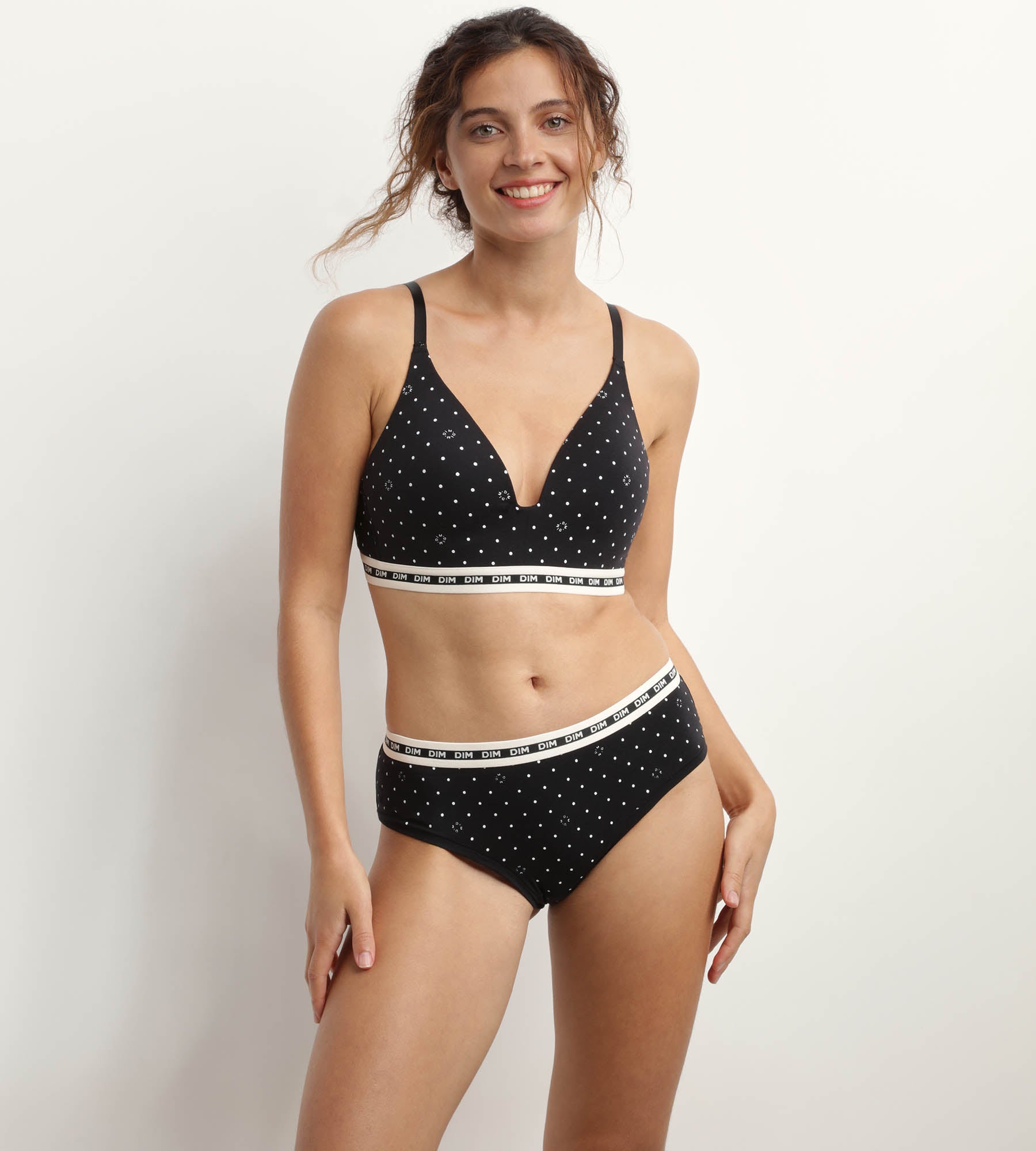Per un insieme coordinato, completa il tuo carrello con gli slip da donna DIM Icons Essenziali, disponibili con motivo a pois e in nero o beige!