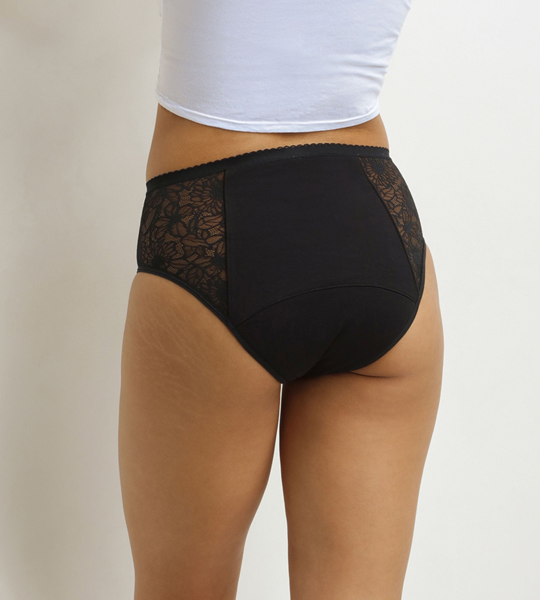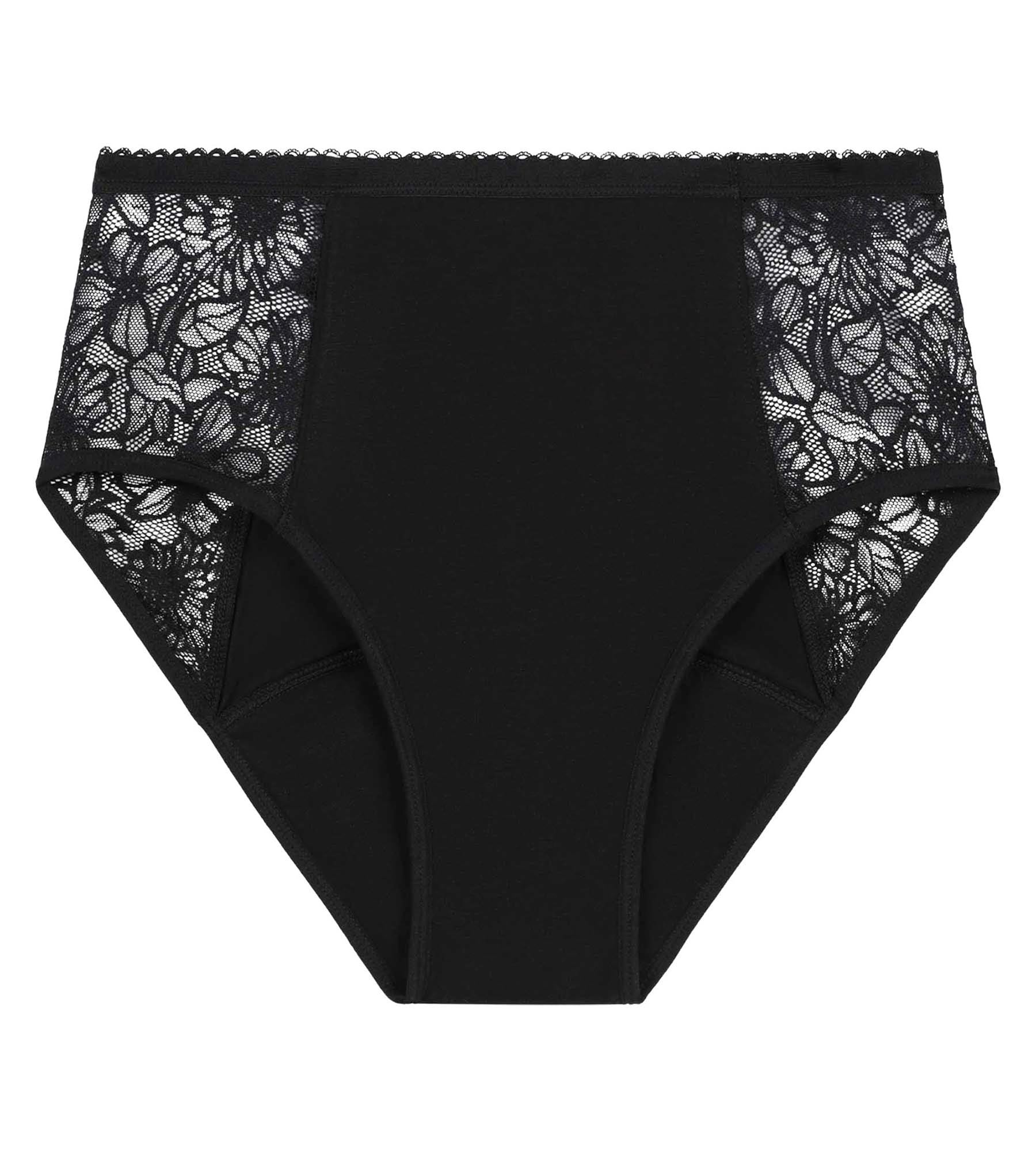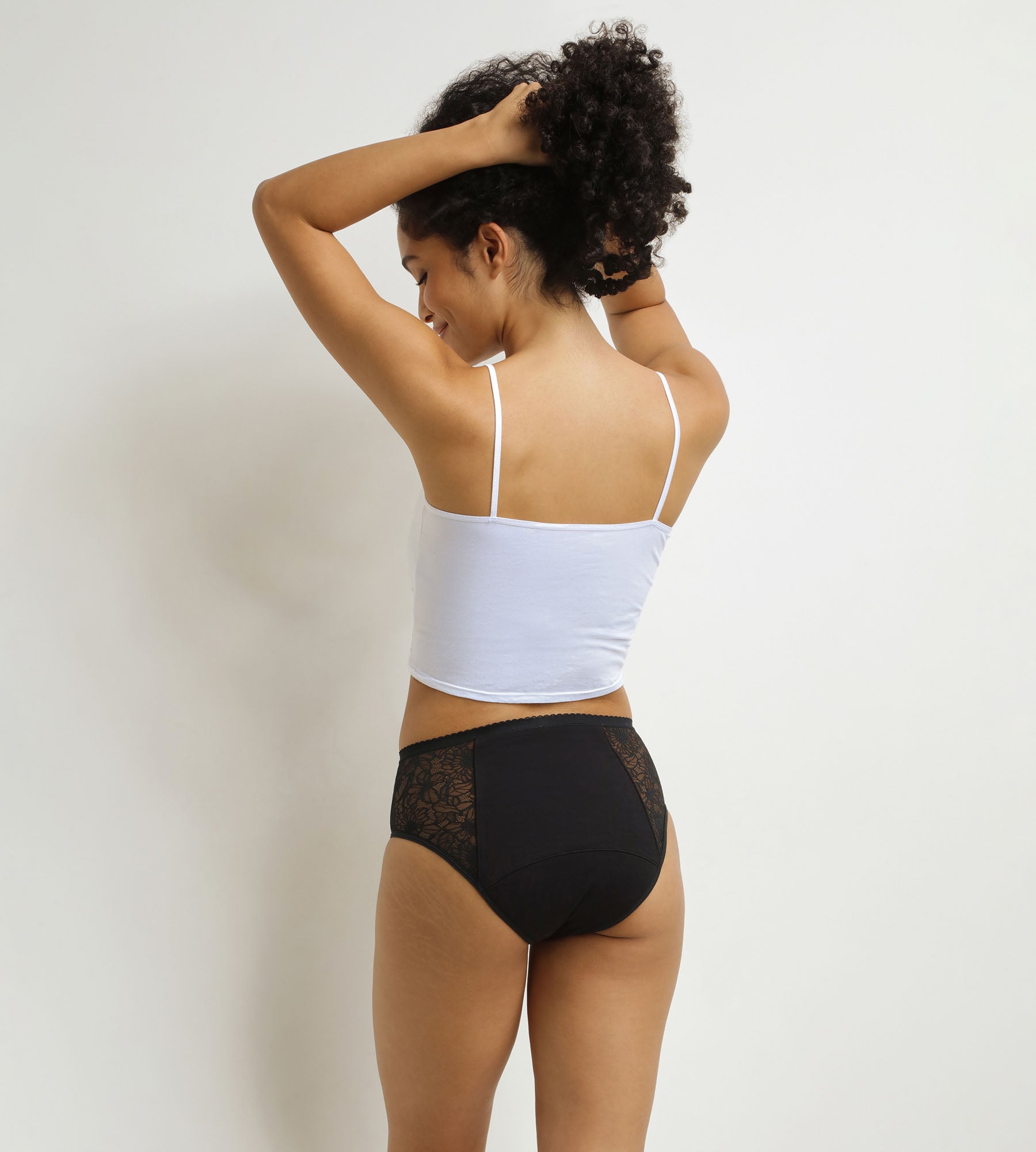 Scegli la mutanda mestruale Dim Protect in cotone biologico e pizzo floreale nero: una protezione affidabile e femminile per flussi molto abbondanti.