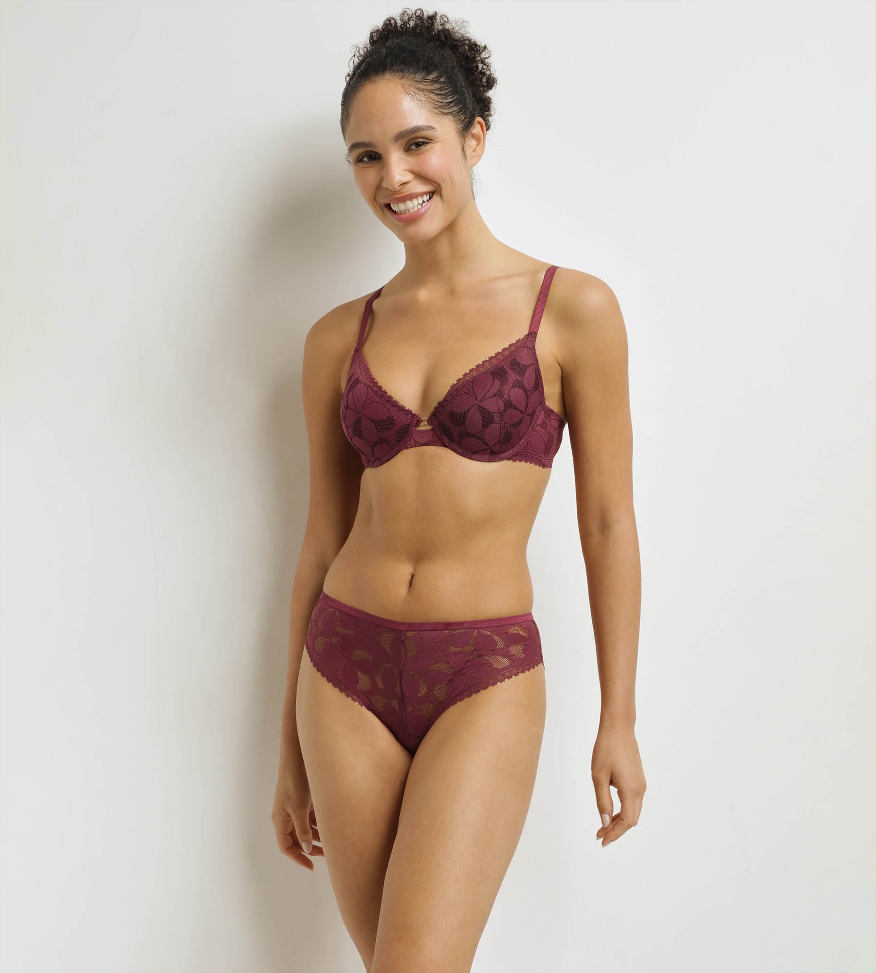 Abbina gli slip in pizzo Art Flower al reggiseno a triangolo, a balconcino o push-up della stessa collezione, nei colori coordinati fico o arancio acido!