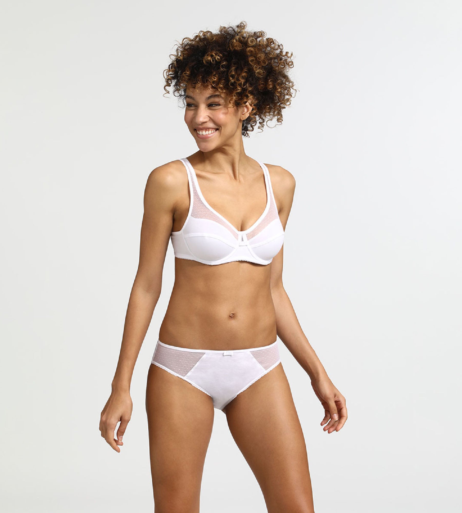 Metti in mostra le tue belle curve con gli slip in cotone-bio bianchi Generous! Morbidissime grazie al comodo cotone organico, queste slip da donna giocano sulla trasparenza con i loro dettagli femminili sui fianchi. Per una bella lingerie bianca, abbinale al reggiseno push-up con ferretto bianco Generous Coton Bio!