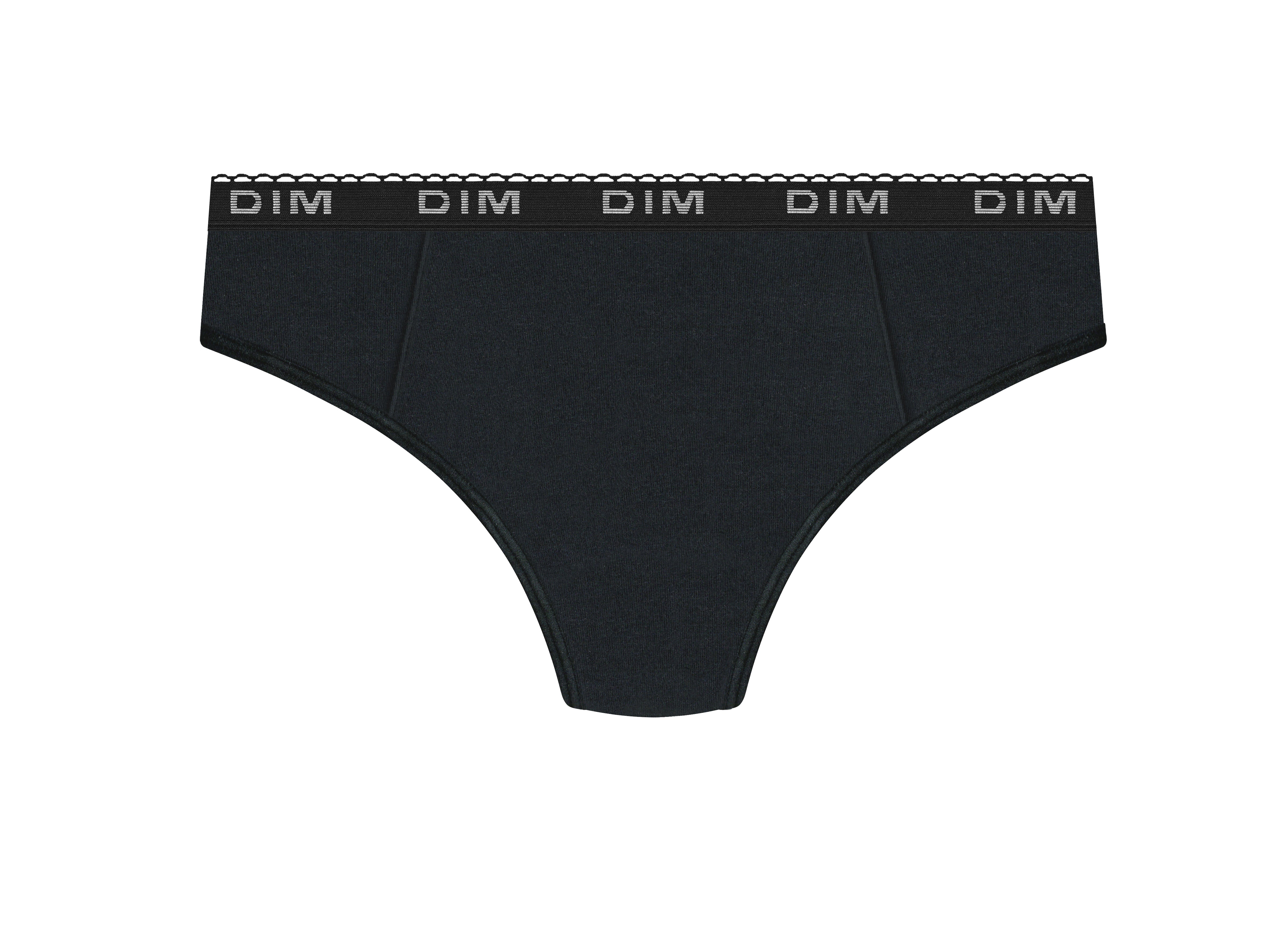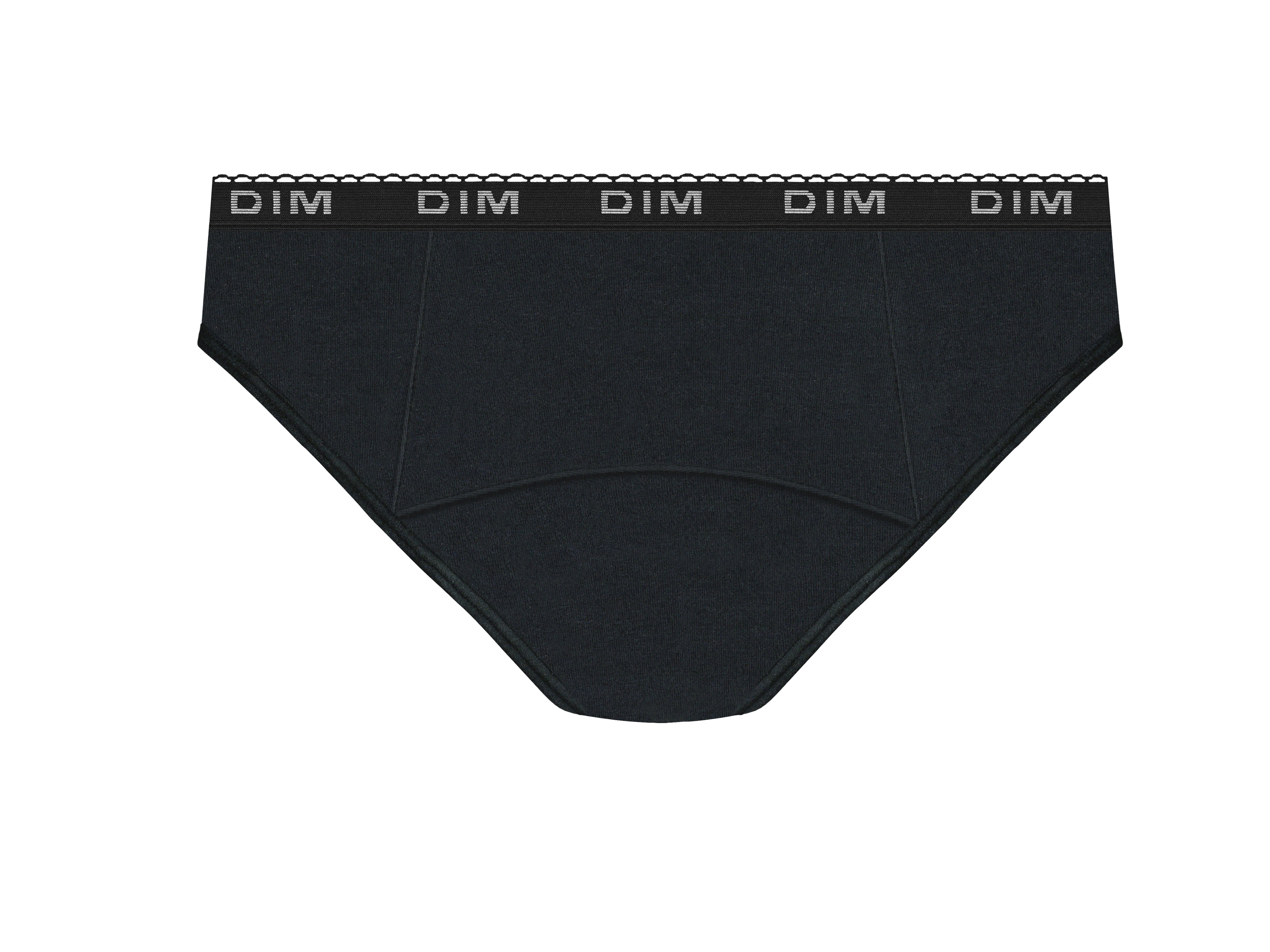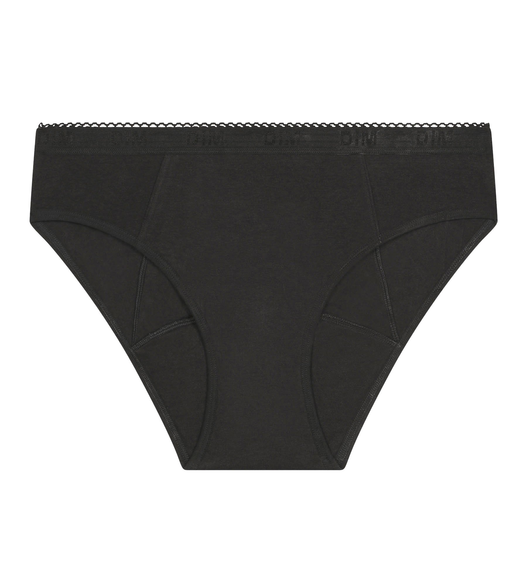 Innamorati del taglio innovativo e delle finiture raffinate delle mutande mestruali Dim Protect in cotone biologico nero - flusso medio-intenso.